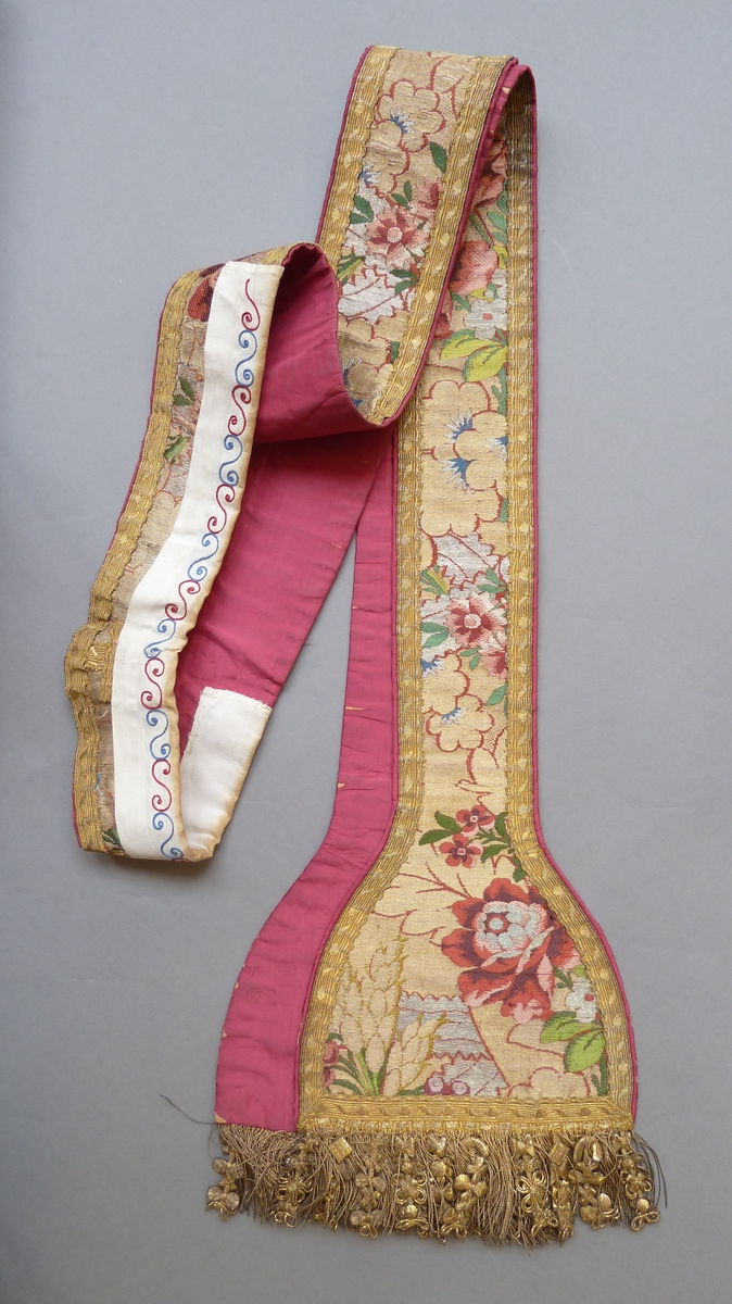 Goudkleurige stola van zijdebrokaat met ingeweven boeketten met goudfranje