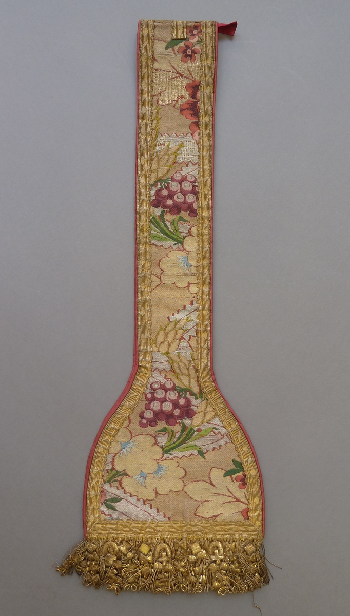 Goudkleurige manipel van zijdebrokaat met ingeweven boeketten en goudgalon, met goudfranje