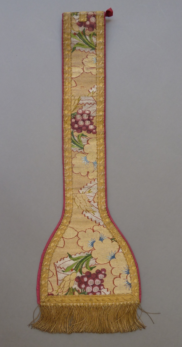 Goudkleurige manipel van zijdebrokaat met ingeweven boeketten en goudgalon, met goudfranje
