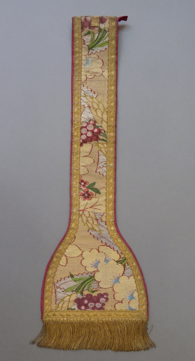 Goudkleurige manipel van zijdebrokaat met ingeweven boeketten en goudgalon, met goudfranje