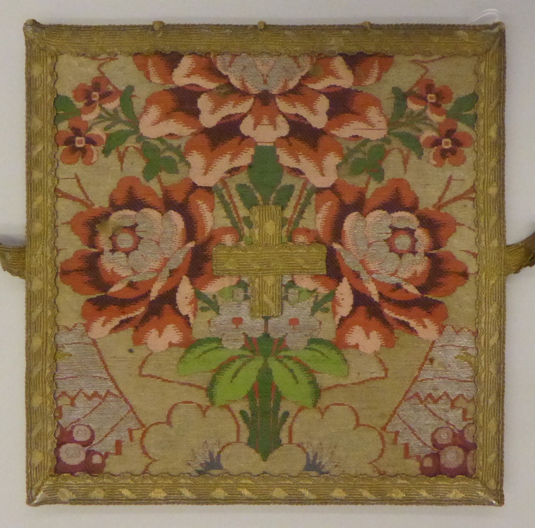 Goudkleurige beurs van zijdebrokaat met ingeweven motief van boeketten