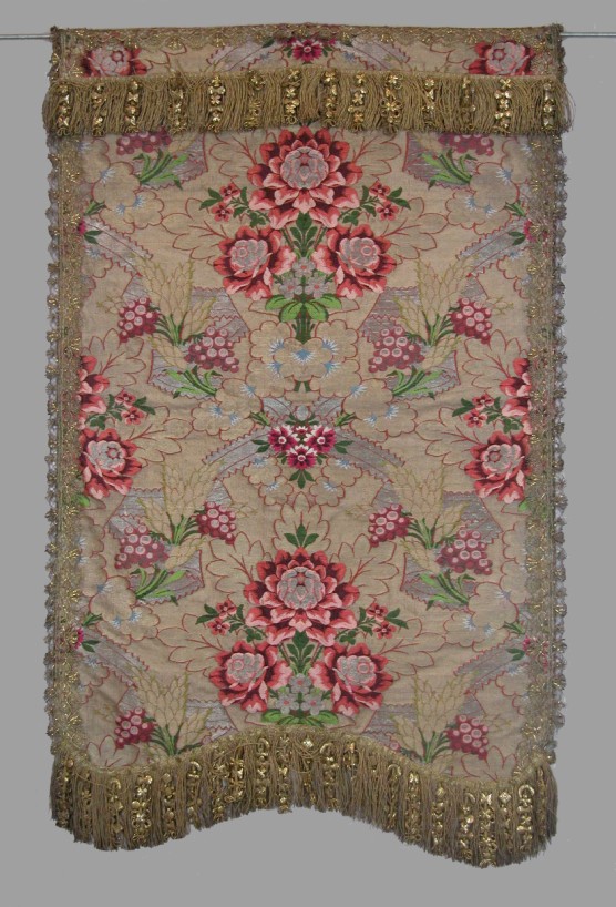 Goudkleurig sacramentsvaandel van zijdebrokaat met ingeweven motief van boeketten