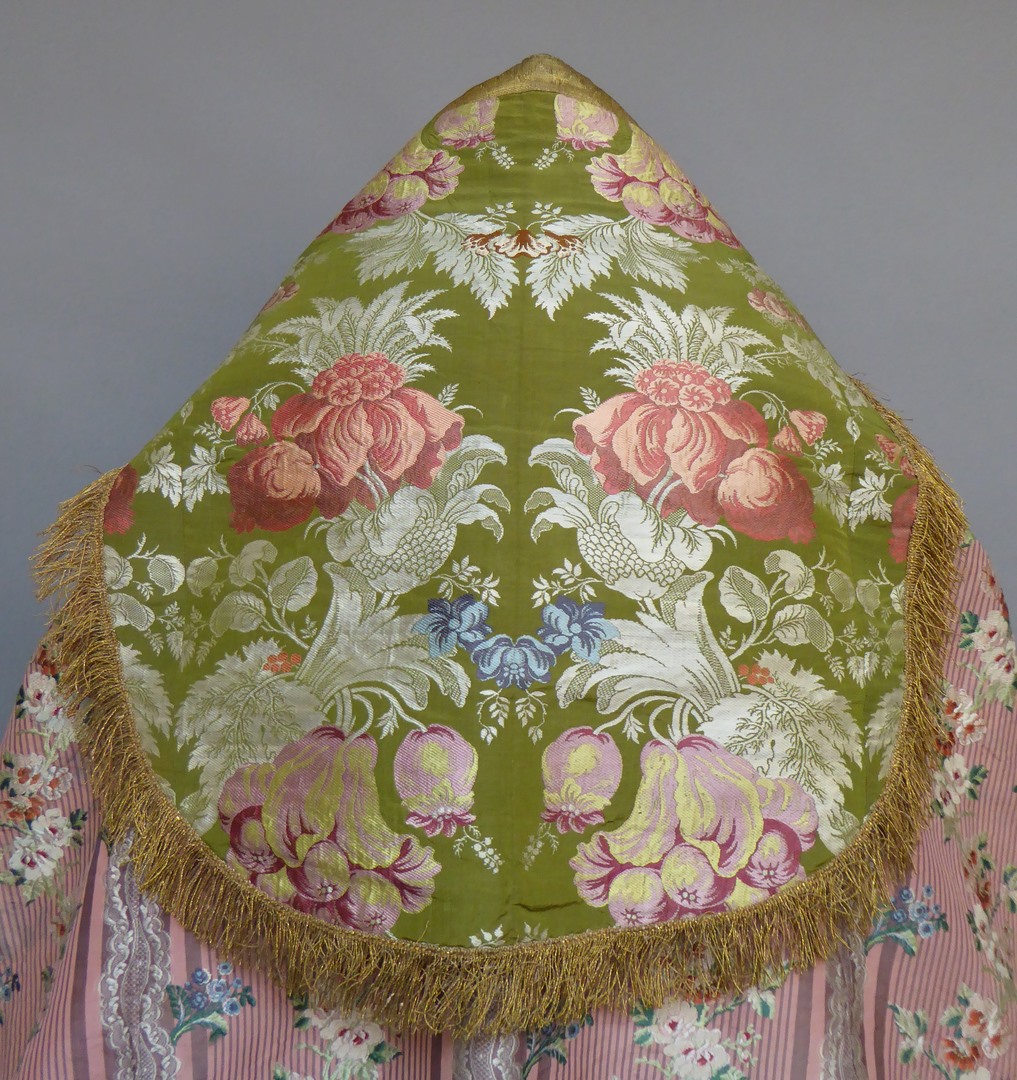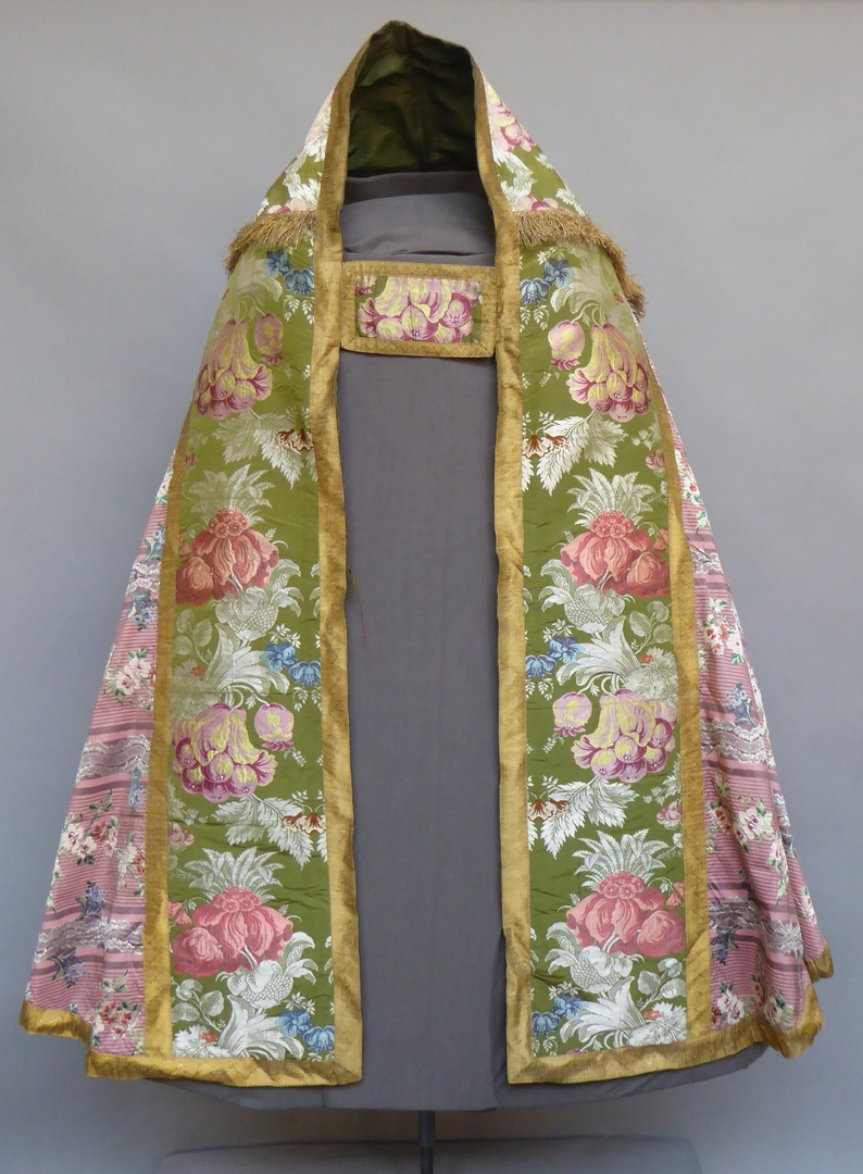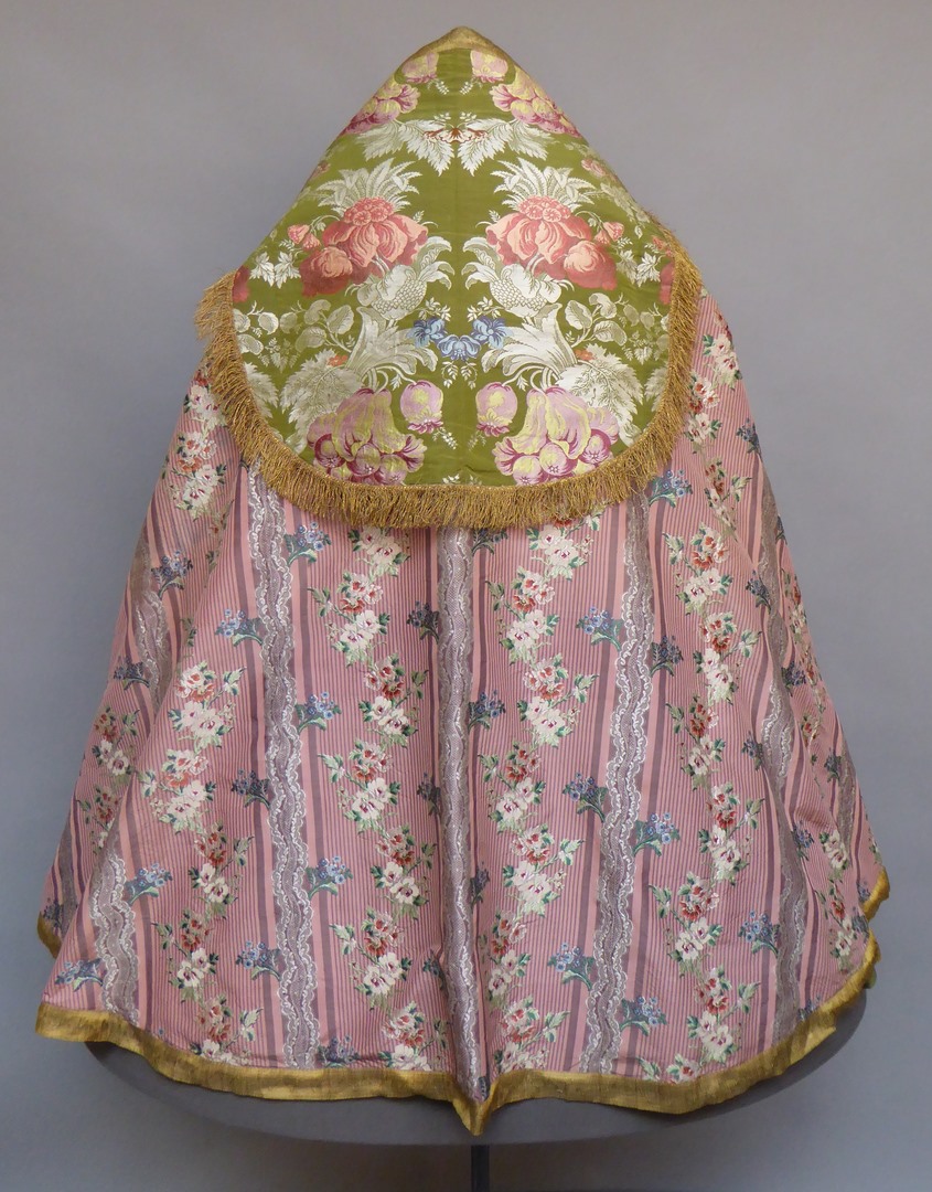 Roze koorkap van gestreepte zijde (Louis XVI) en groene zijde met ingeweven patroon van bloemen