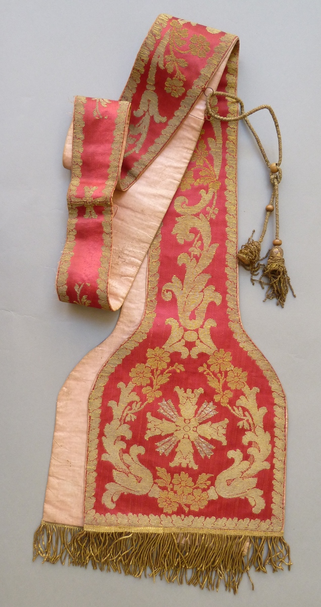 Rode stola van goudbrokaat met ingeweven plantenrinceaux, afgezet met een vegetatieve band