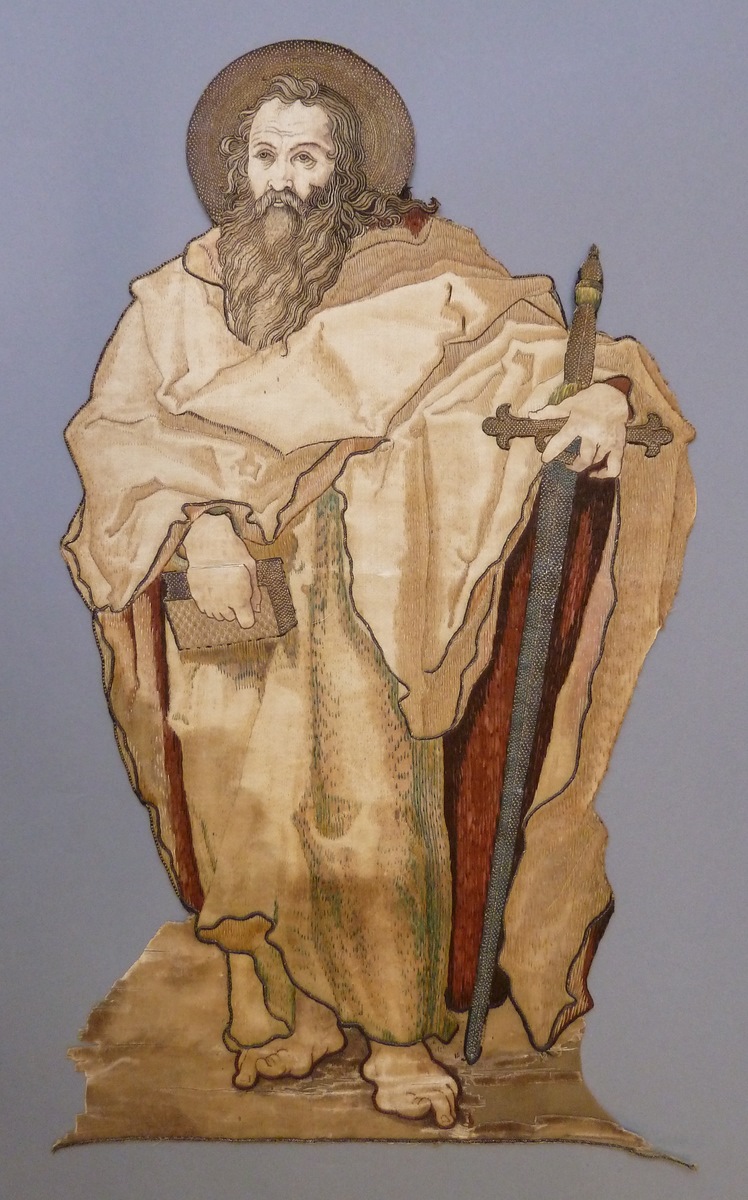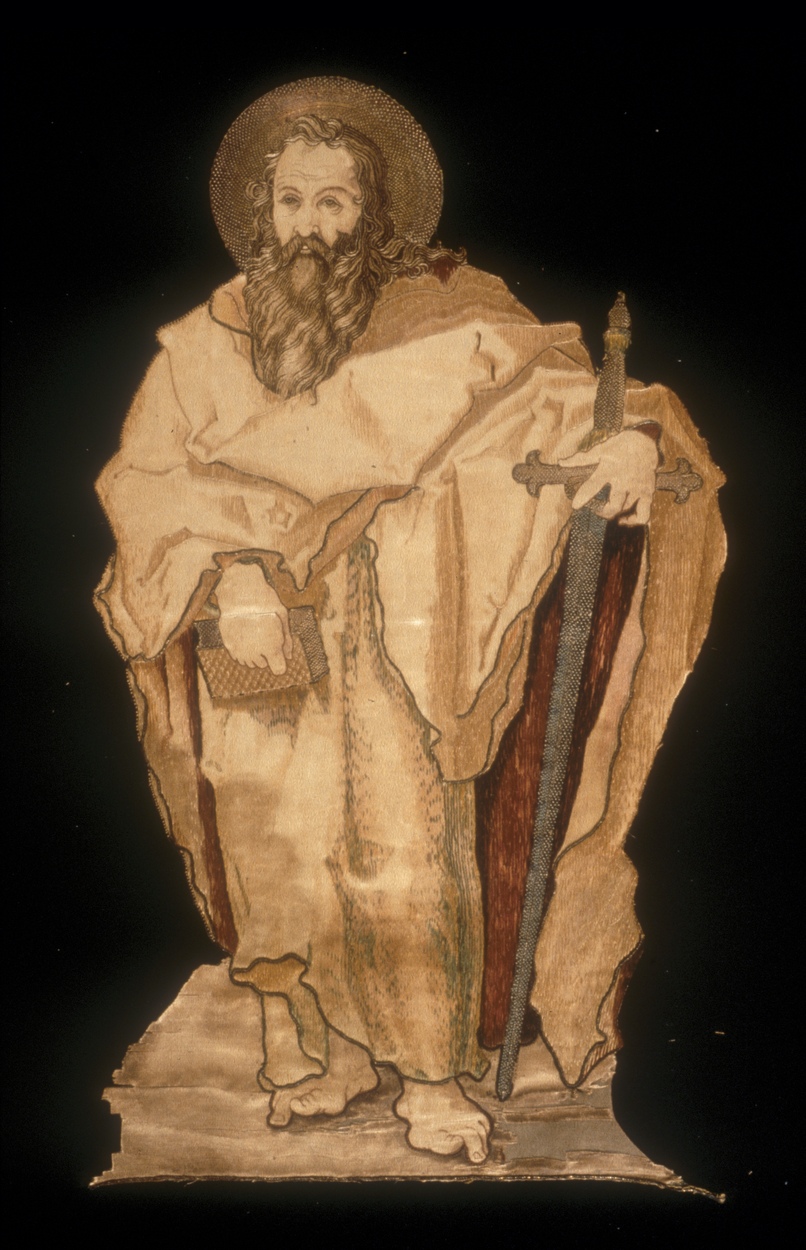 Het borduurfragment stelt de bebaarde apostel Paulus voor. Hij is blootvoets en gaat gehuld in een opgeschort gewaad en ruimvallende mantel. Met de linkerhand steunt hij op zijn attribuut, een zwaard; in de rechterhand houdt hij een boek. Techniek: delen van de kleding en de lichaamspartijen zijn ingeschilderd. De contouren van de kleding en de ...
