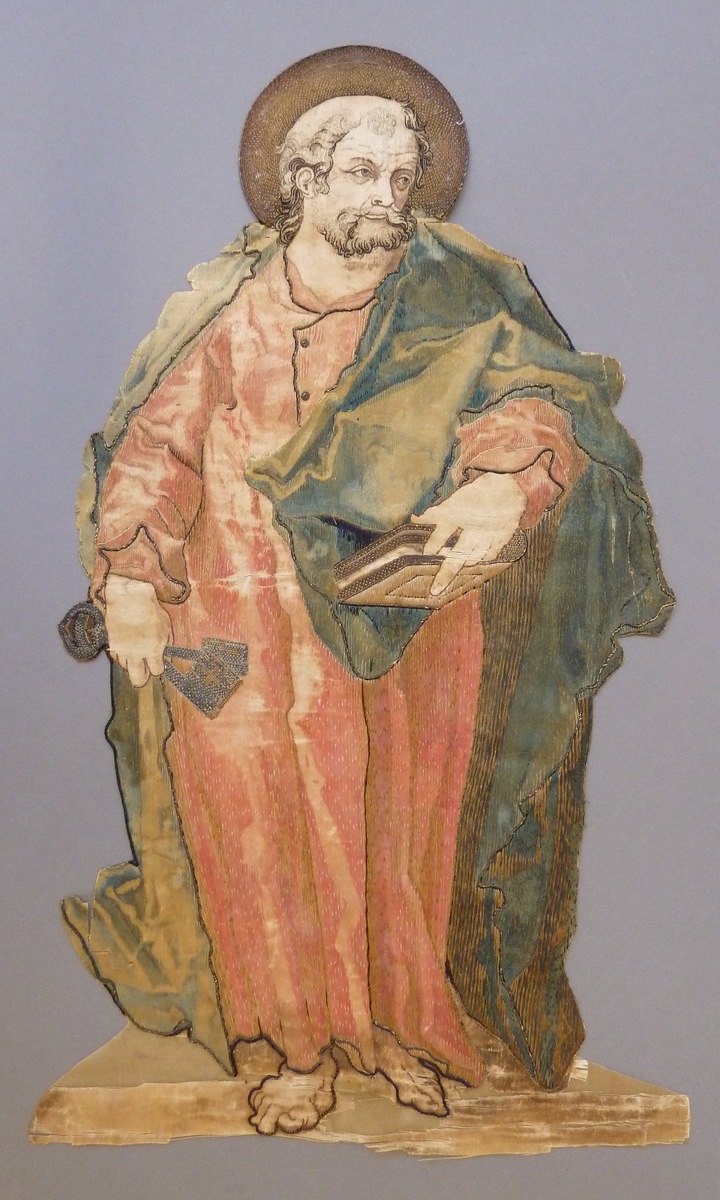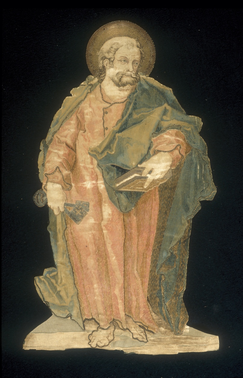 Het borduurfragment stelt de ietwat kalende apostel Petrus voor. Hij heeft een korte baard, is blootvoets en gaat gekleed in een gewaad, dat aan de hals met twee knopen gesloten wordt. Daar overheen is een ruimvallende mantel gedrapeerd. Petrus houdt in de rechterhand zijn attributen, twee sleutels. In de linkerhand houdt hij een boek, dat ...