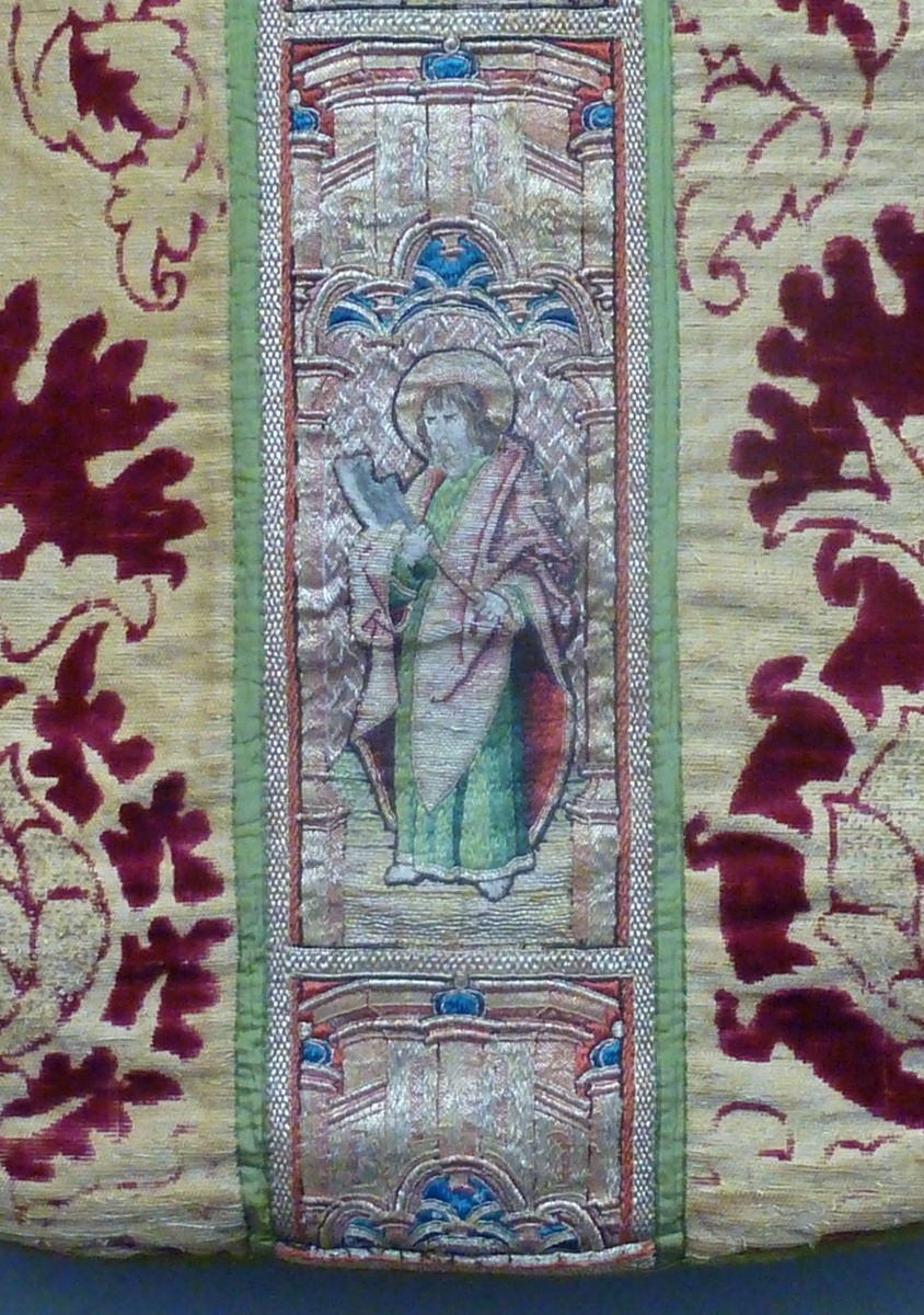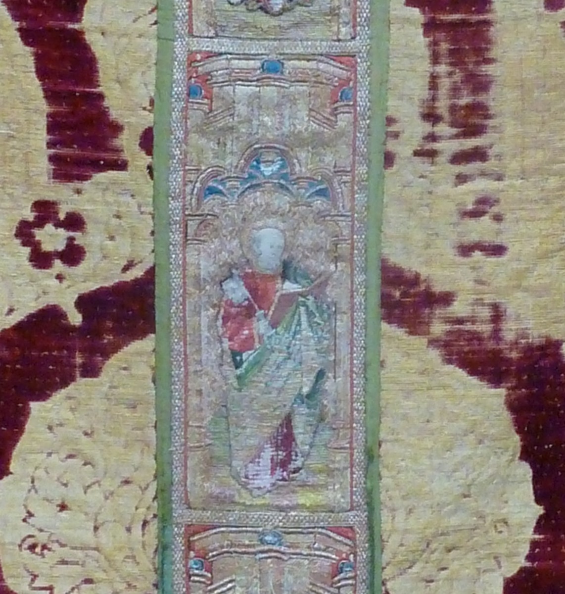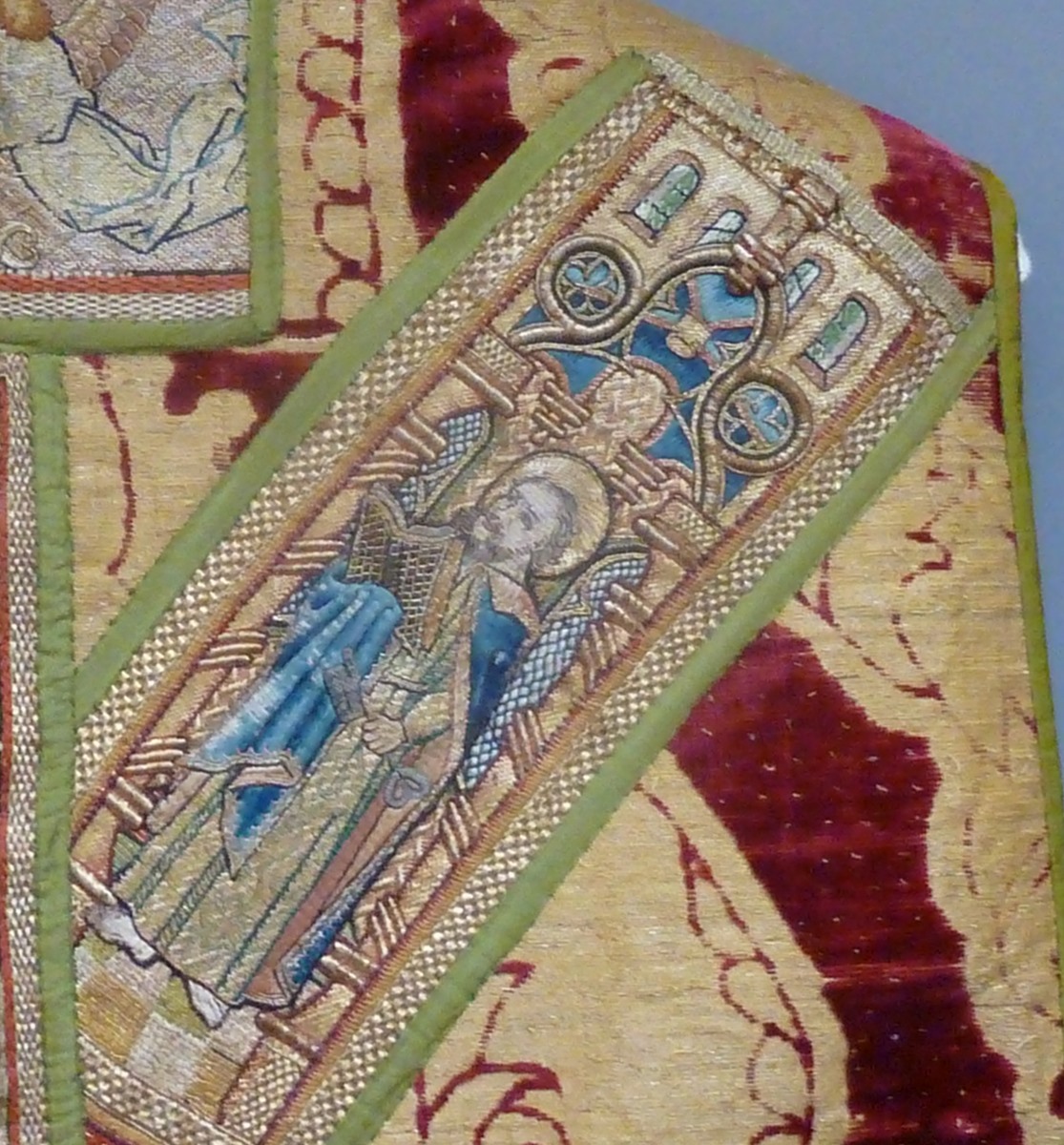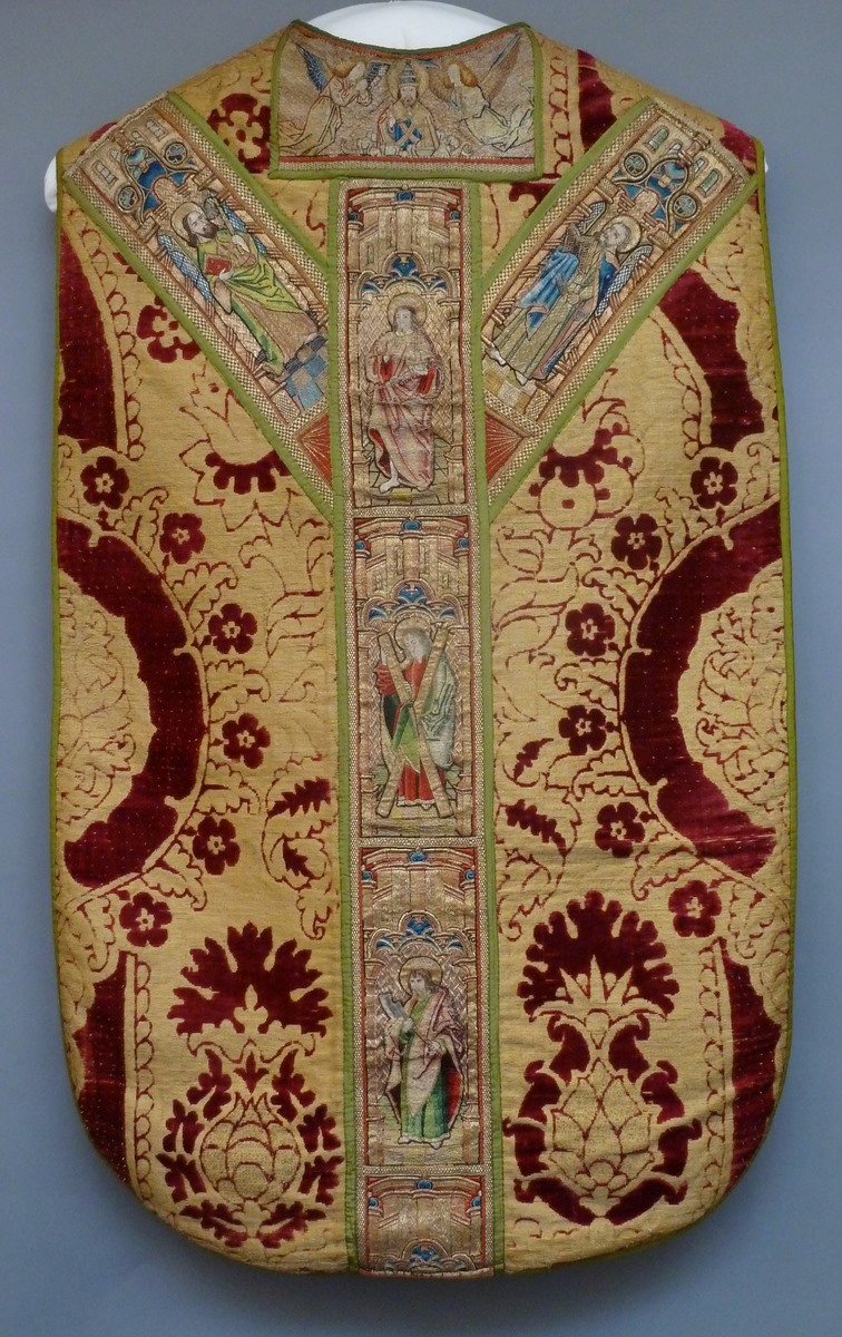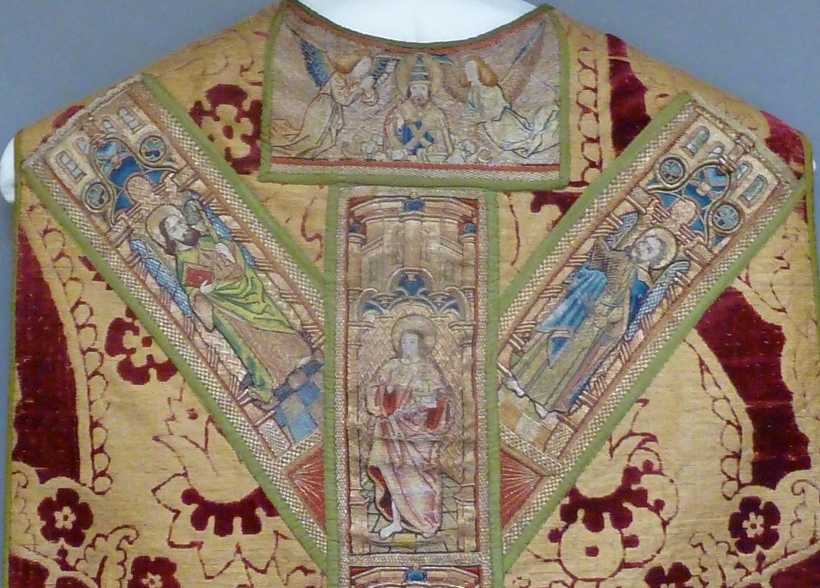 Rood kazuifel met granaatappelmotief en God de vader boven zegenende Christus met werelbol