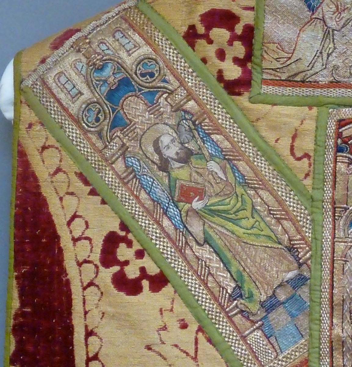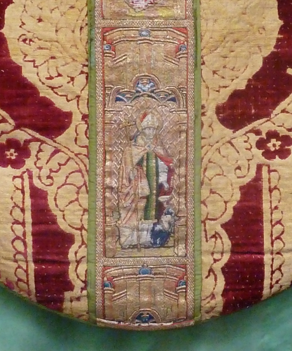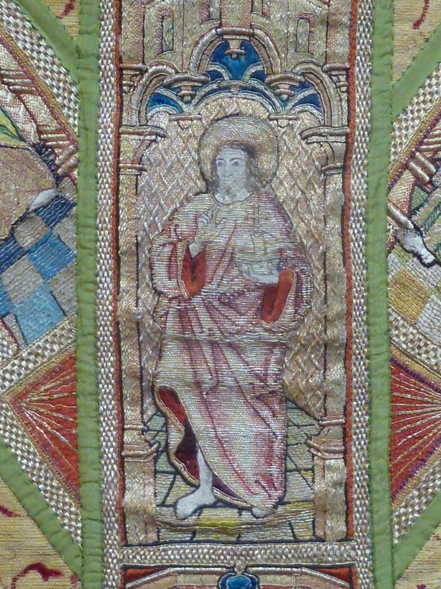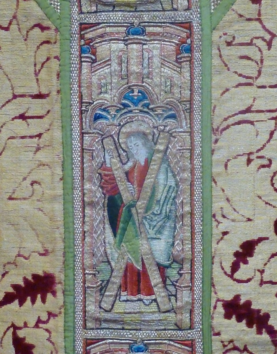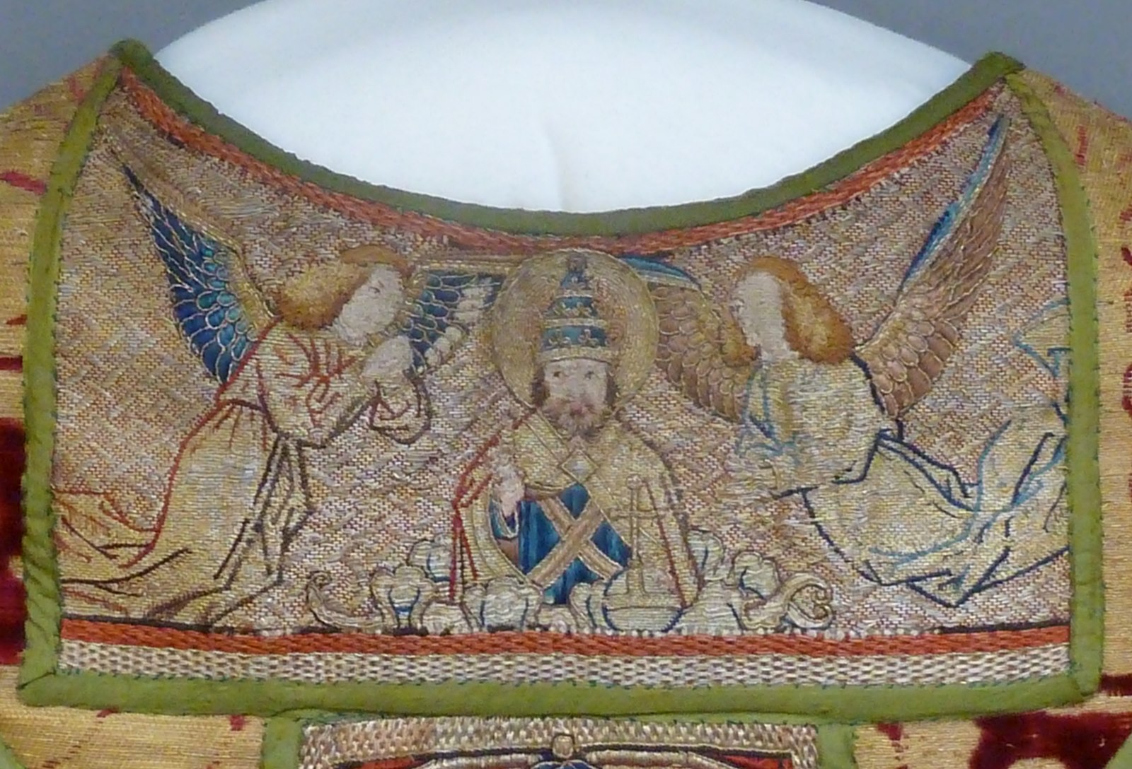 Rood kazuifel met granaatappelmotief en God de vader boven zegenende Christus met werelbol