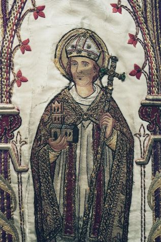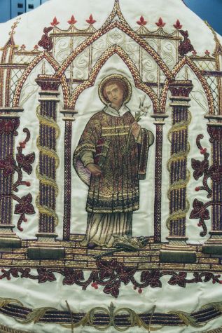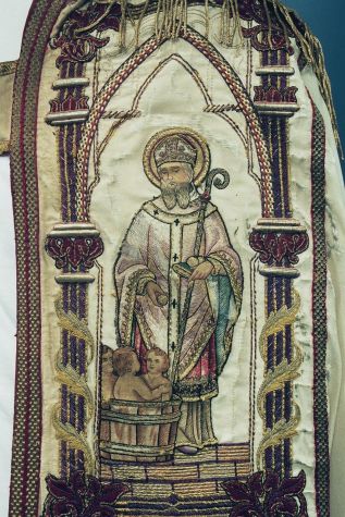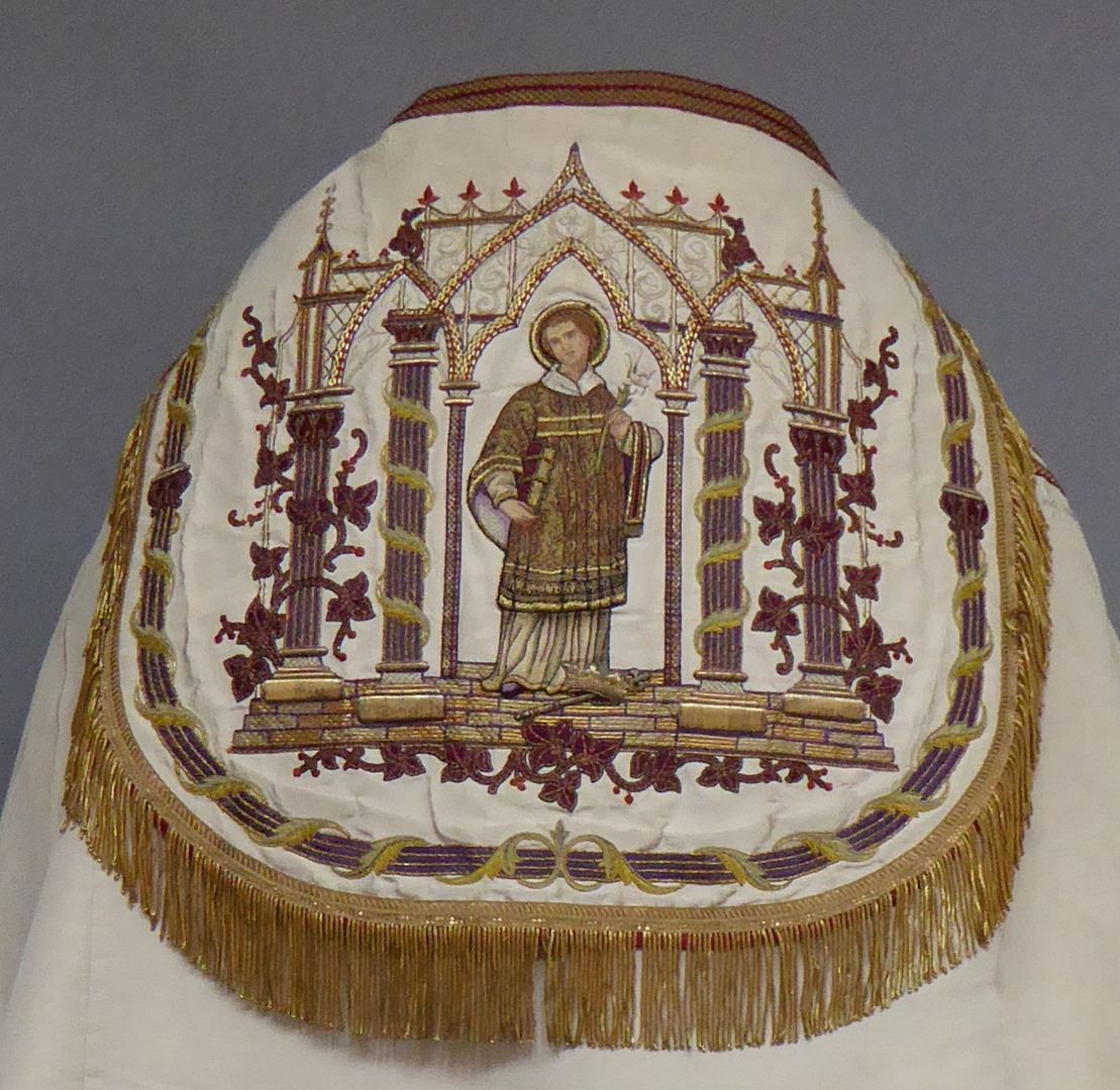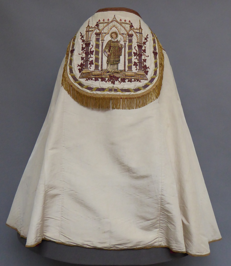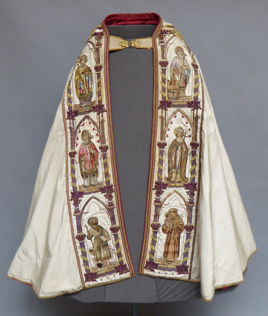 Witte koorkap met heiligen onder neogotische baldakijnen, op schild H. Aloysius Gonzaga