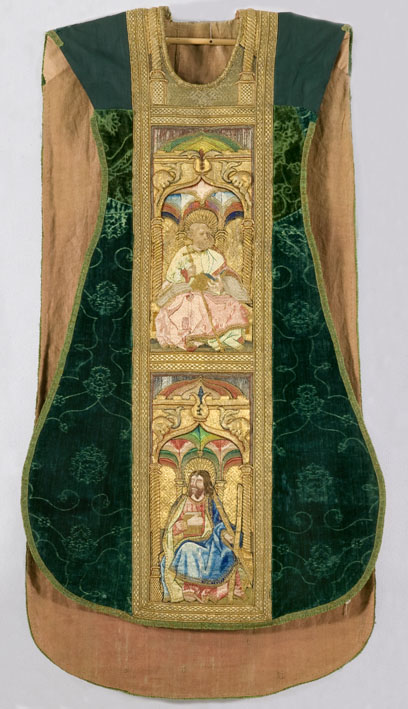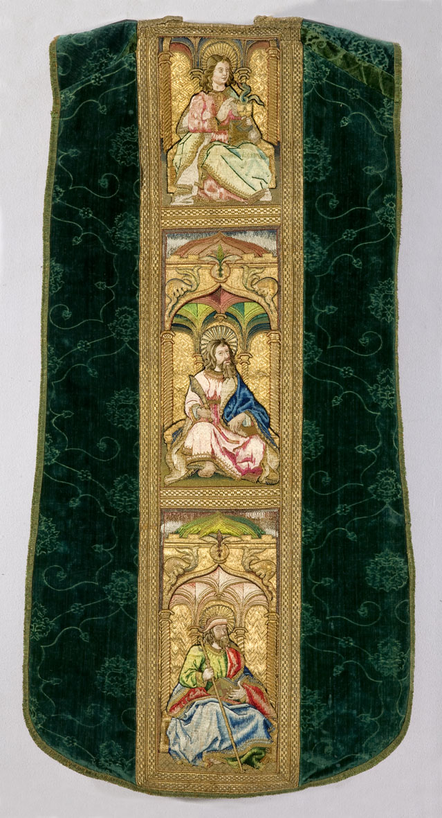 Groen kazuifel van Venetiaans fluweel op voorzijde (van boven naar beneden) H. Petrus en H. Andreas, op achterzijde (van boven naar beneden) H. Johannes de Evangelist, H. Bartholomeus en H. Jacobus de Meerdere