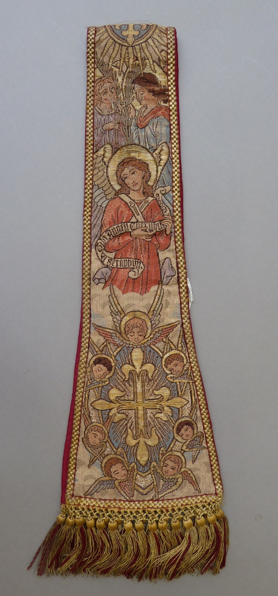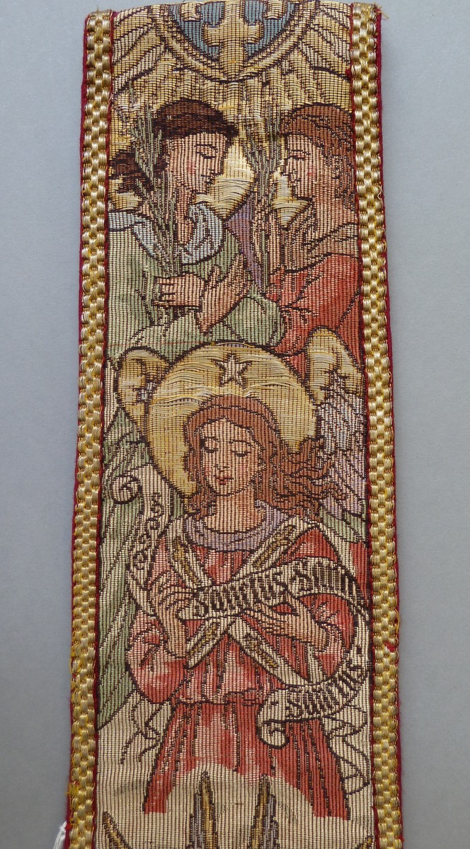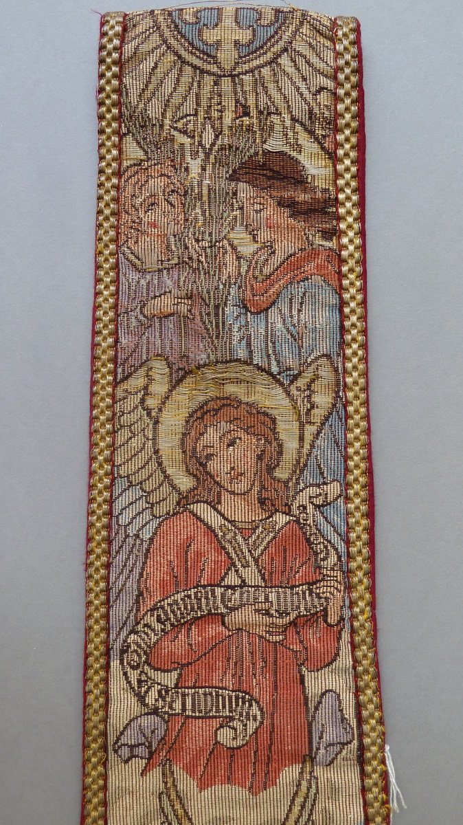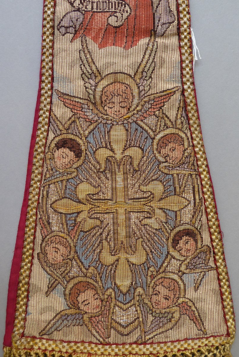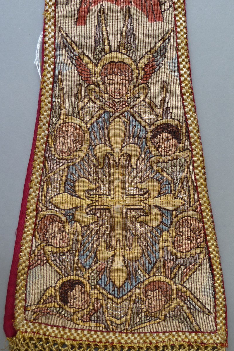 Manipel met aan beide zijden een kruisje omgeven door cherubkopjes, daarboven engel met banderol