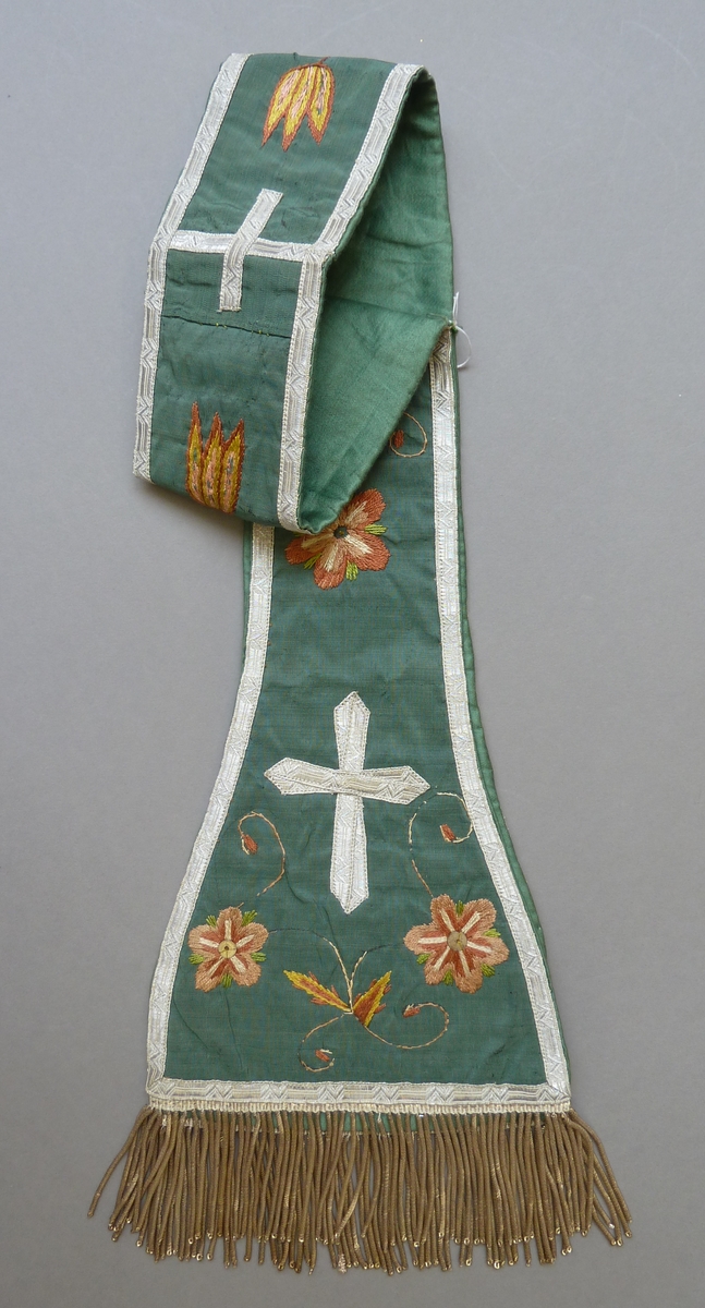 Groen manipel met bloemen, knoppen en ranken, met zilverfranje