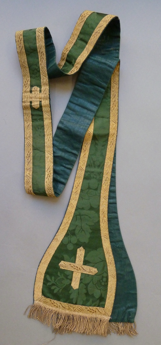 Groene stola met ingeweven bloempatroon, kruisjes van goudgalon