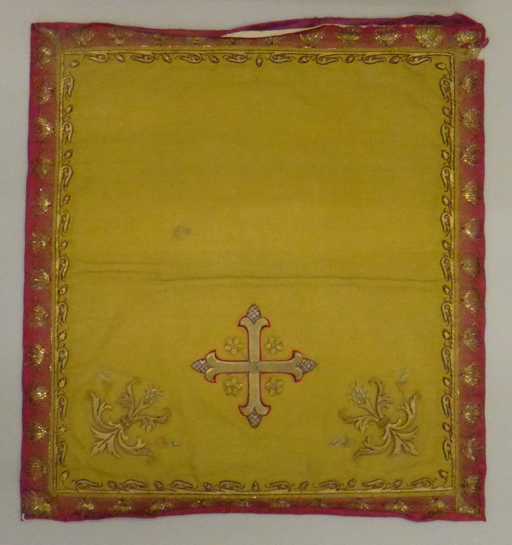 Goudbrokaat kelkvelum met ranken- en bloemknopmotief in goud- en zilverdraad