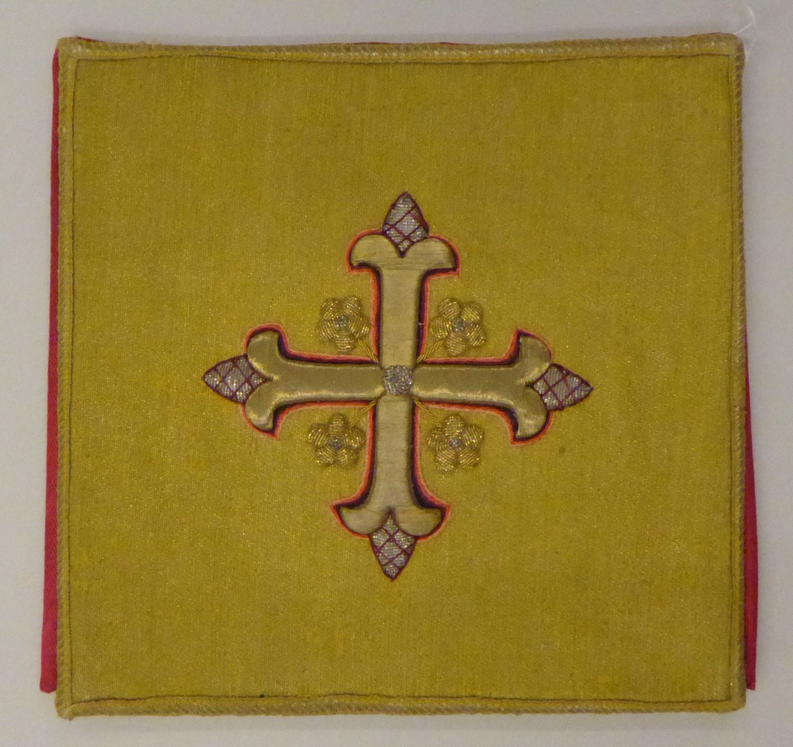 Goudbrokaat beurs met leliekruis van gehoogd gouddraad met lelies en rood-zilveren knoppen