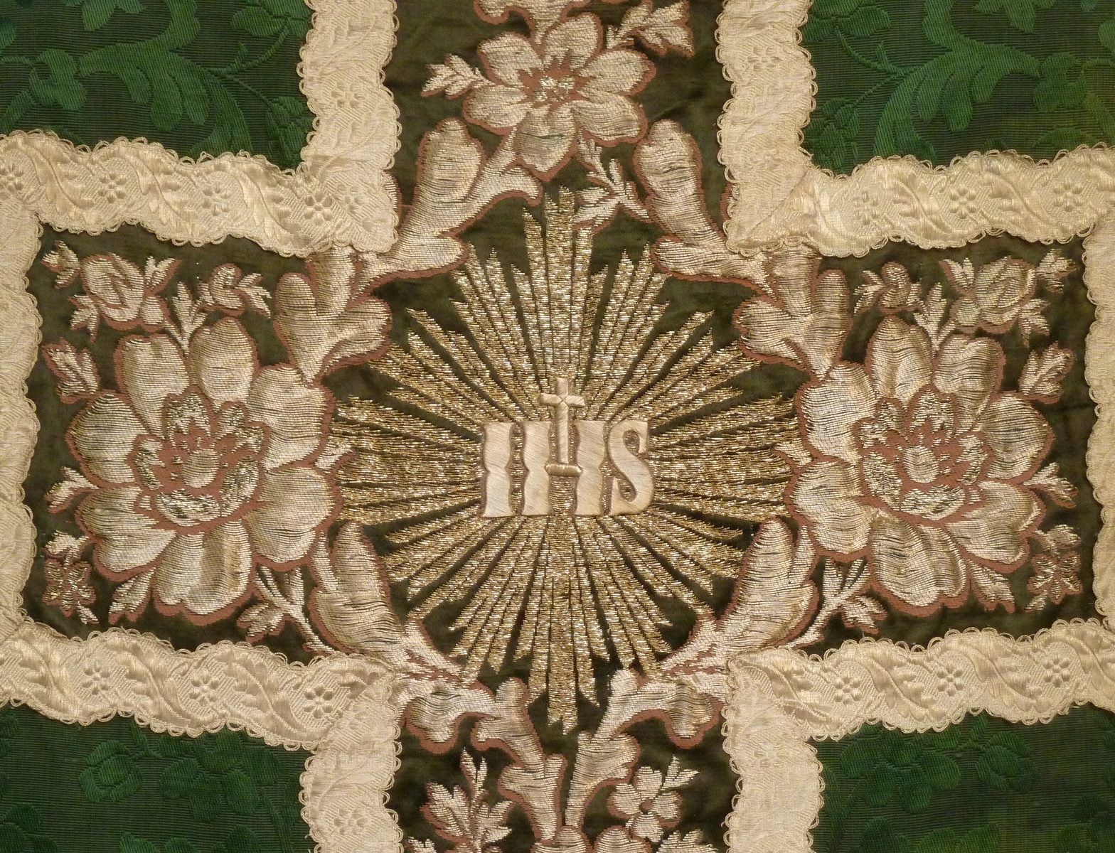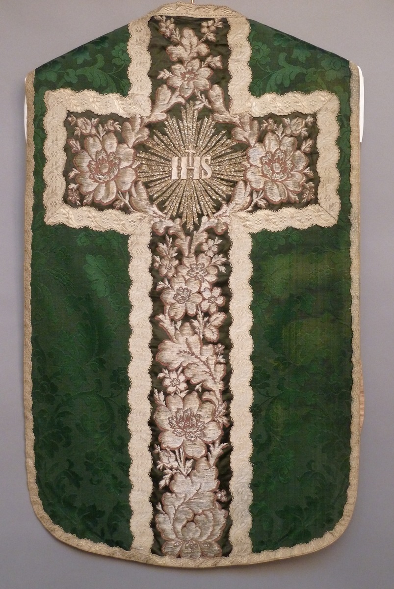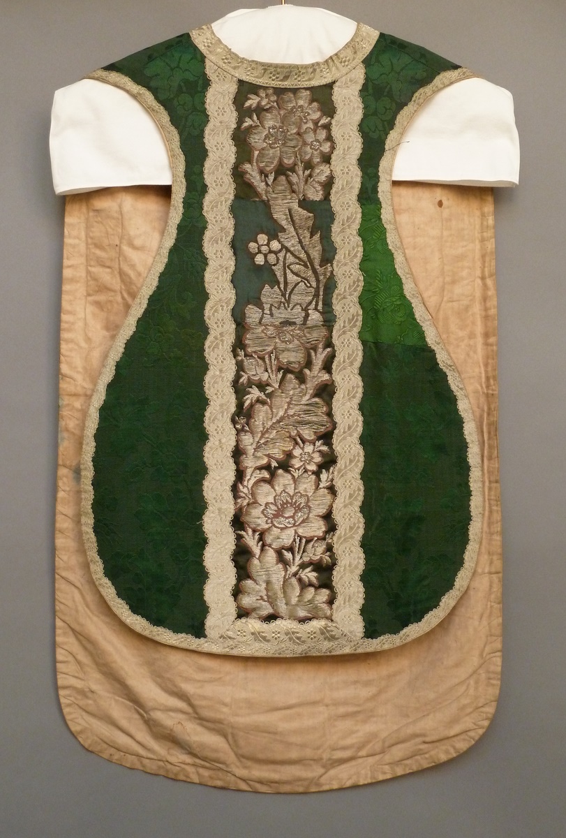 Groen kazuifel met ingeweven bloempatroon met zilverdraad geborduurde bloem-en bladmotieven
