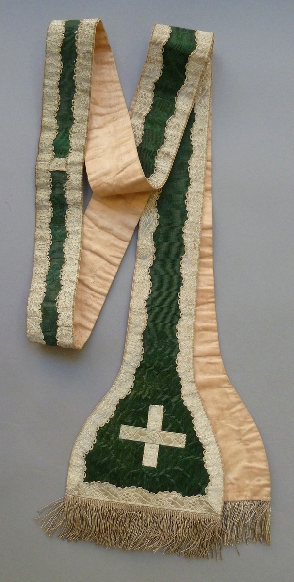 Groene stola met ingeweven bloempatroon, afgezet met zilvergalon