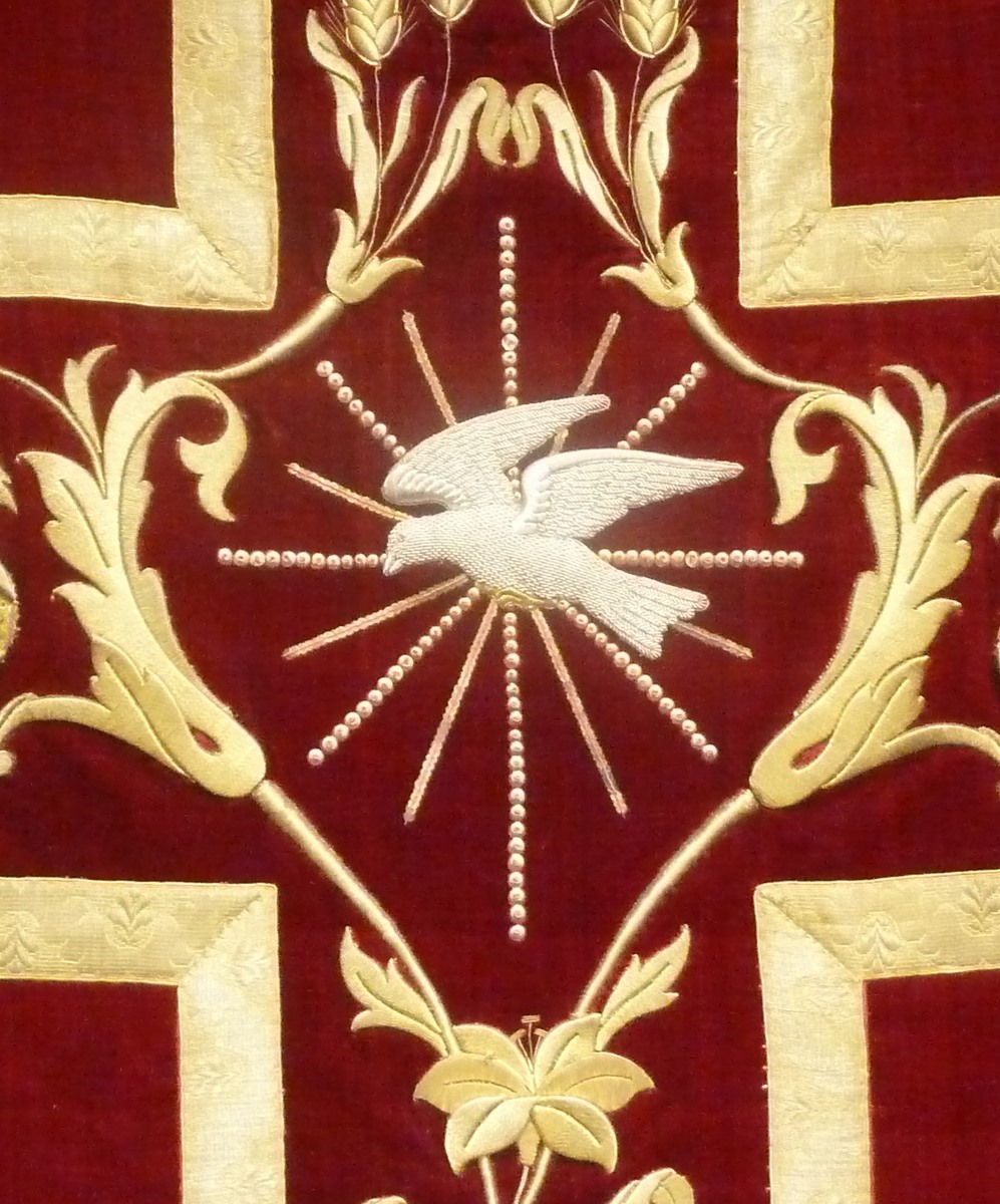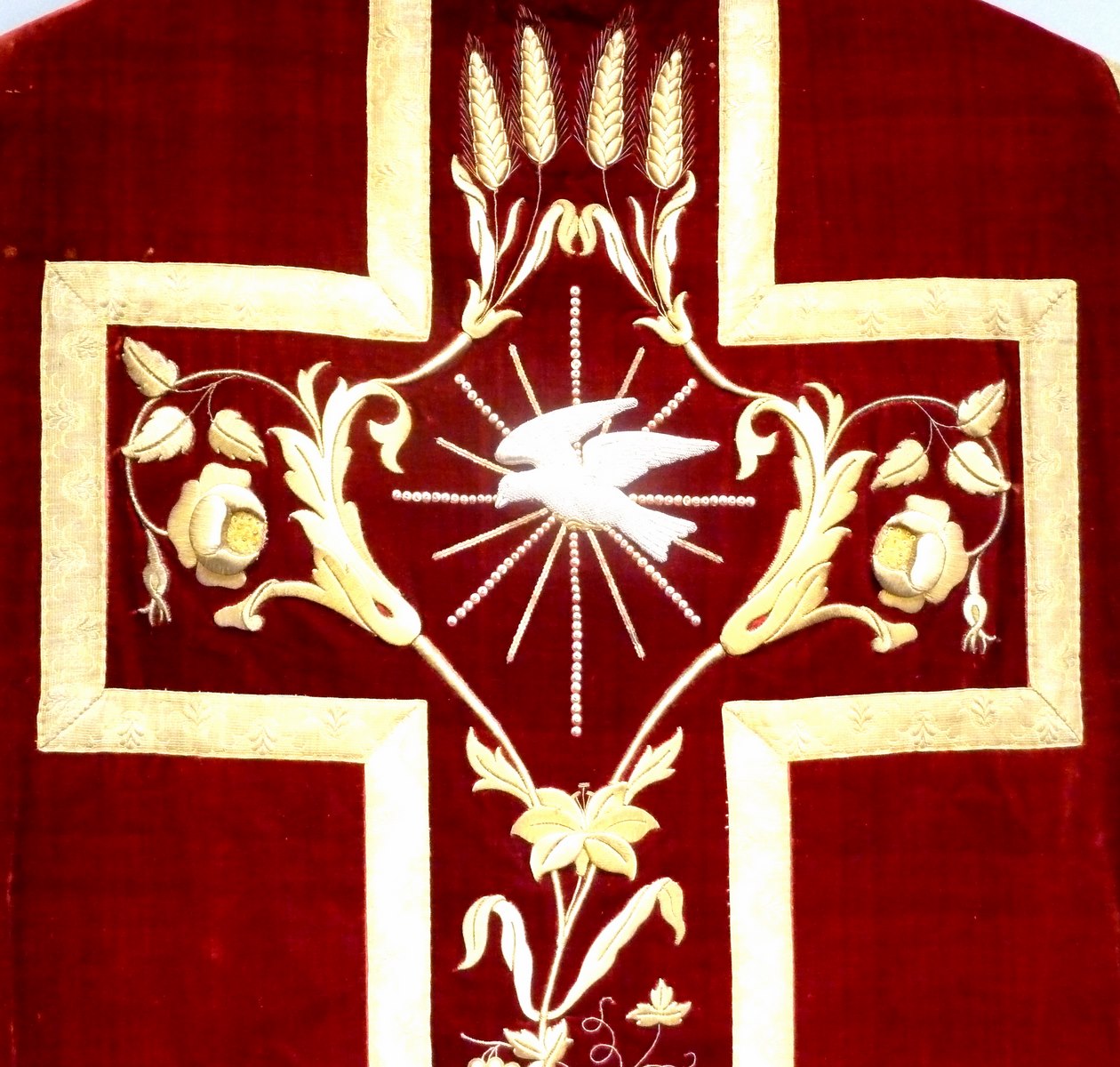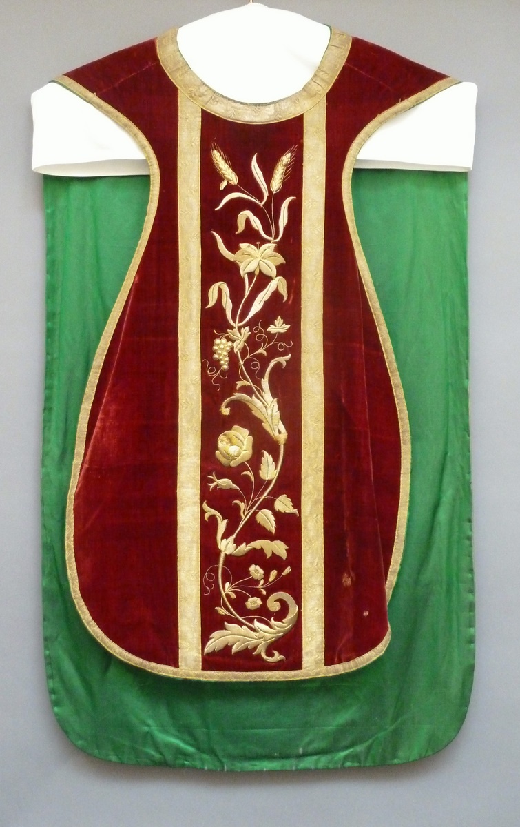Rood kazuifel met goudgalon kruis waarin korenaren, druiventros, bloemen en duif