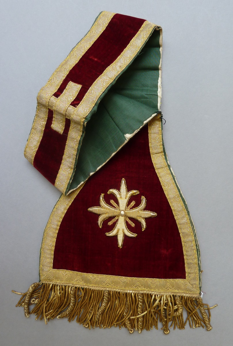 Rode manipel afgezet met goudgalon en aan uiteinden kruis van gouddraad