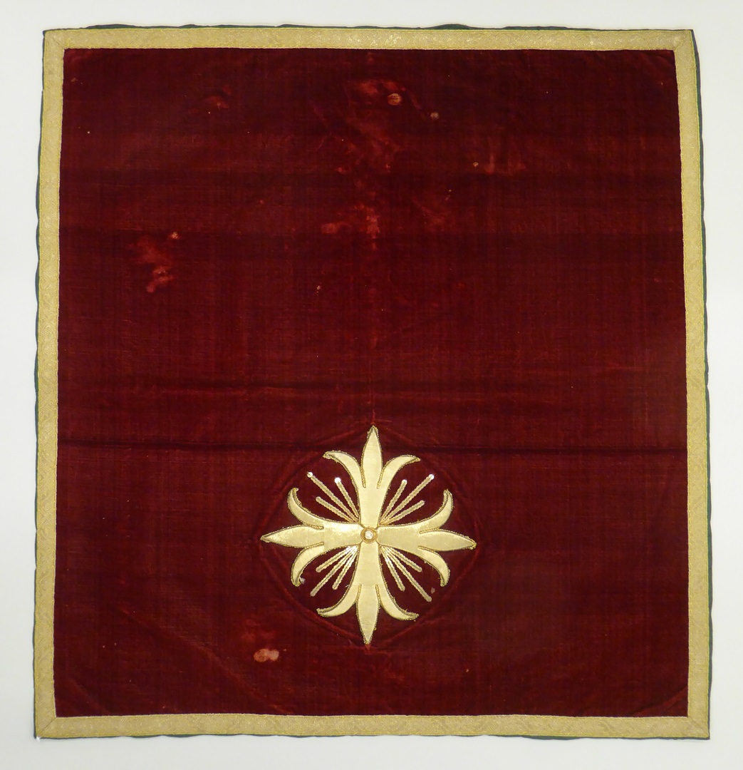 Rood kelkvelum met kruis van gouddraad, afgezet met goudgalon