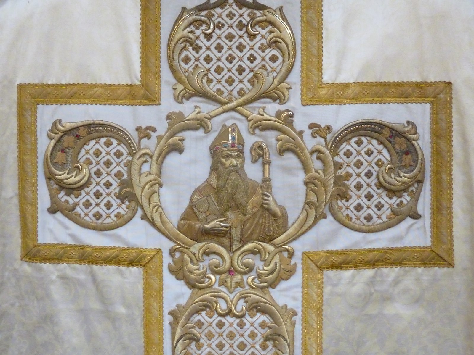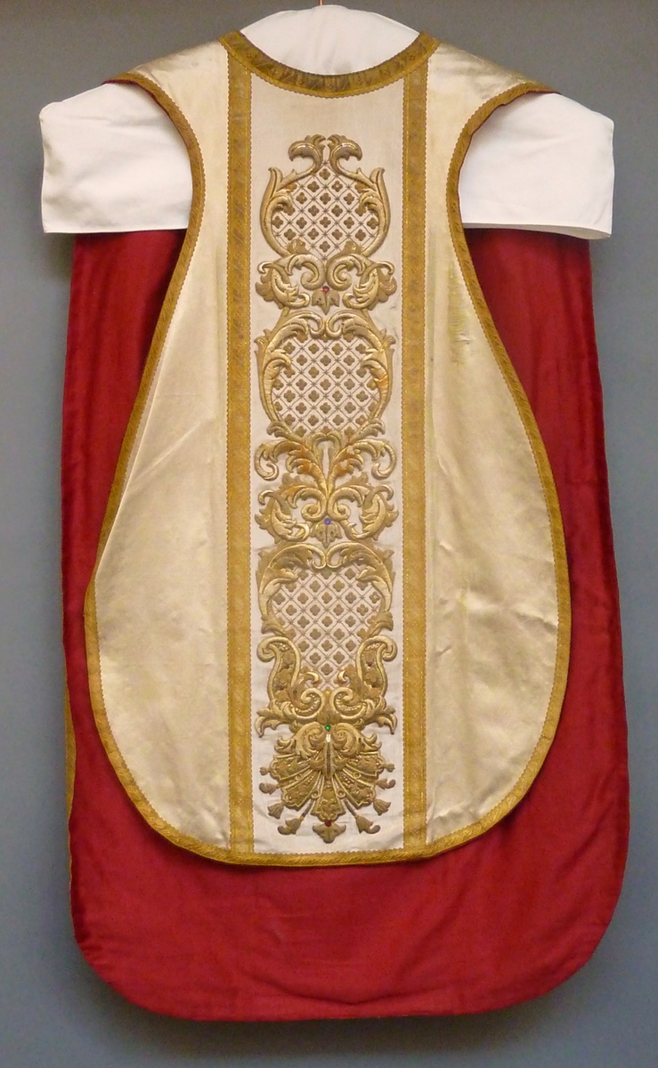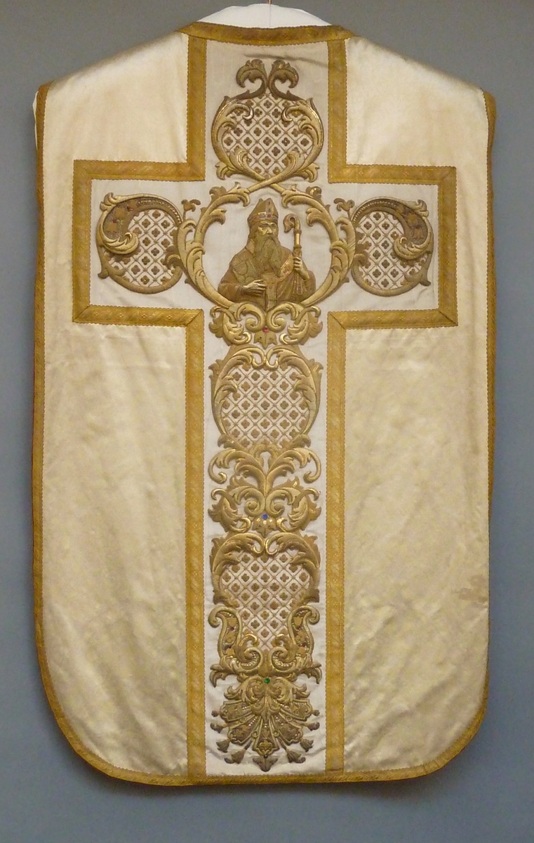 Wit kazuifel met buste van abt in kruis, versiering van cartouches en rankenmotieven