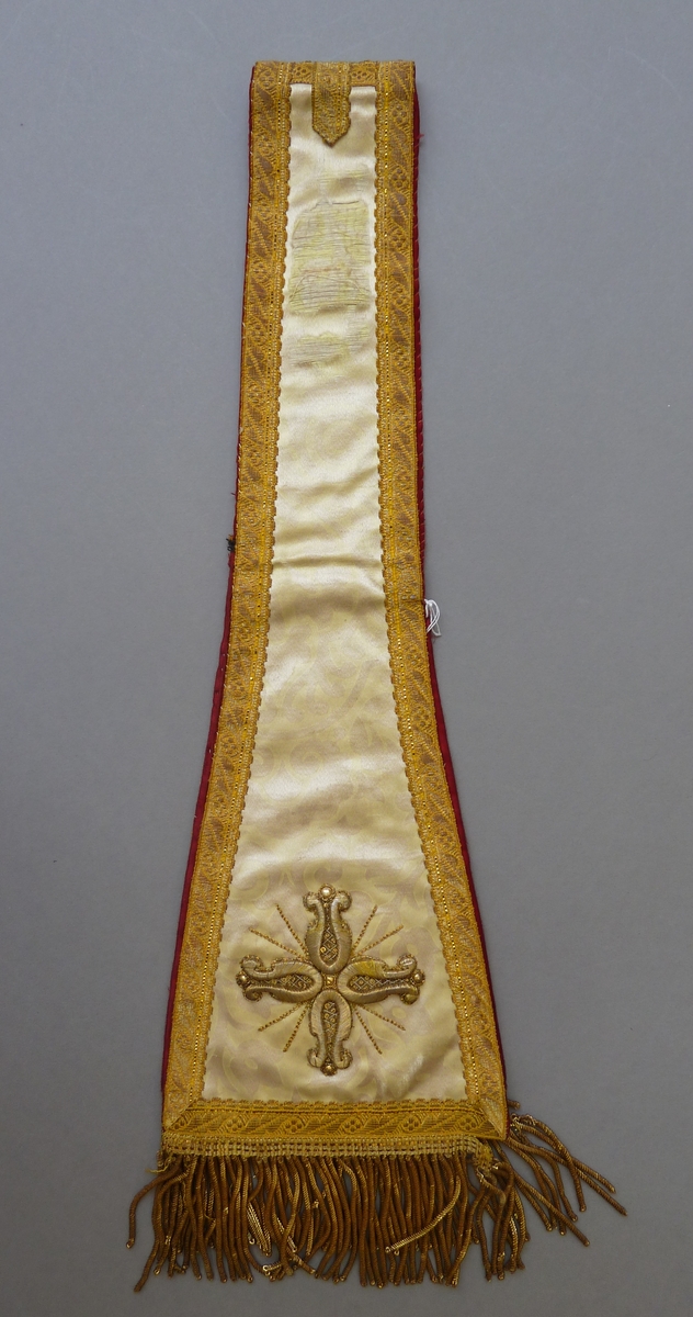 Witte manipel van goudkleurig gebloemde zijde met gouddraad kruisjes