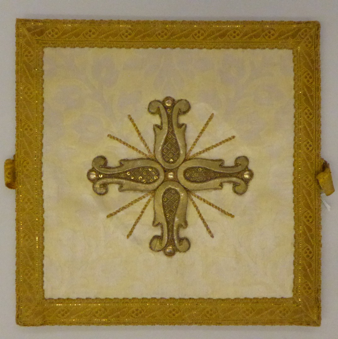 Witte beurs van goudgebloemde stof met gouddraad kruis