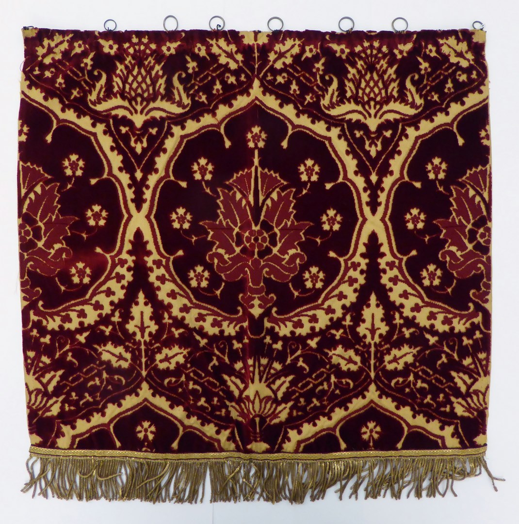 Rood tabernakelgordijntje met ingeschoren granaatappelmotief, afgezet met goudfranje