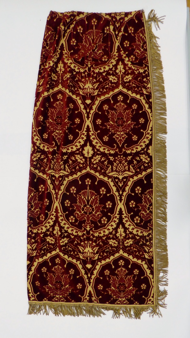 Helft van gordijn voor expositietroon met ingeschoren granaatappelmotief, afgezet met goudfranje