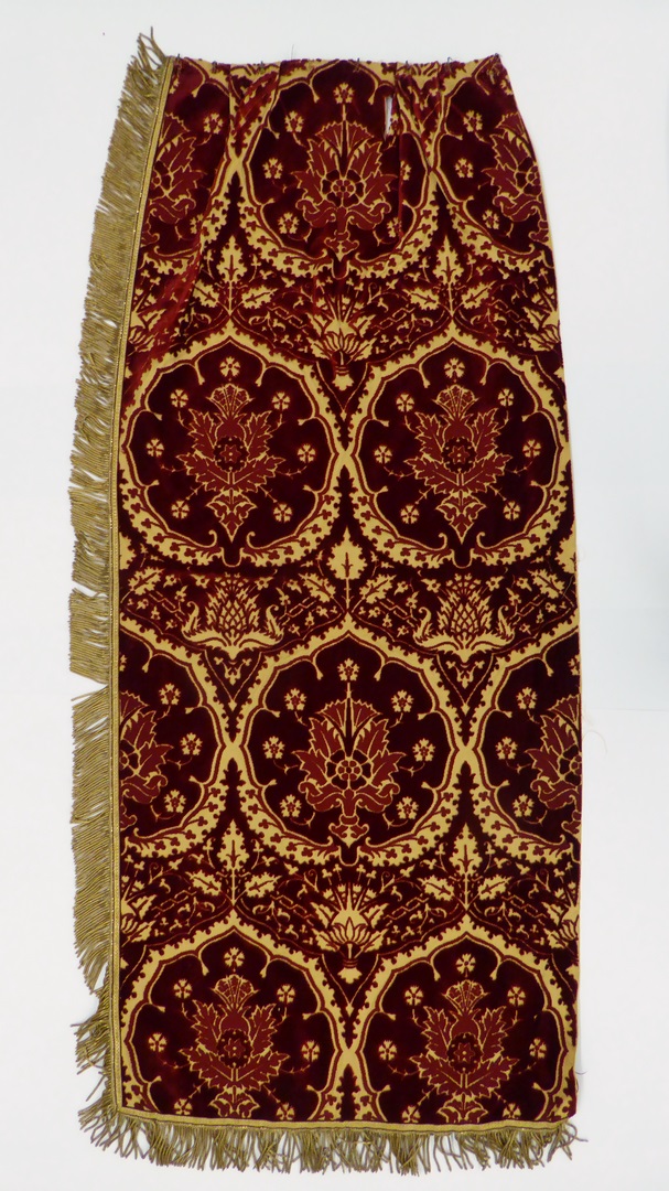 Helft van gordijn voor expositietroon met ingeschoren granaatappelmotief, afgezet met goudfranje