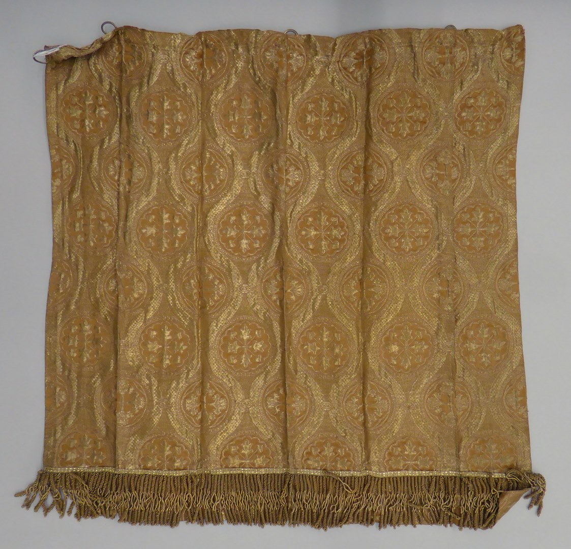 Goudkleurig tabernakelgordijn met ingeweven kruisvormige bloem- en bladmotieven afgezet met goudfranje