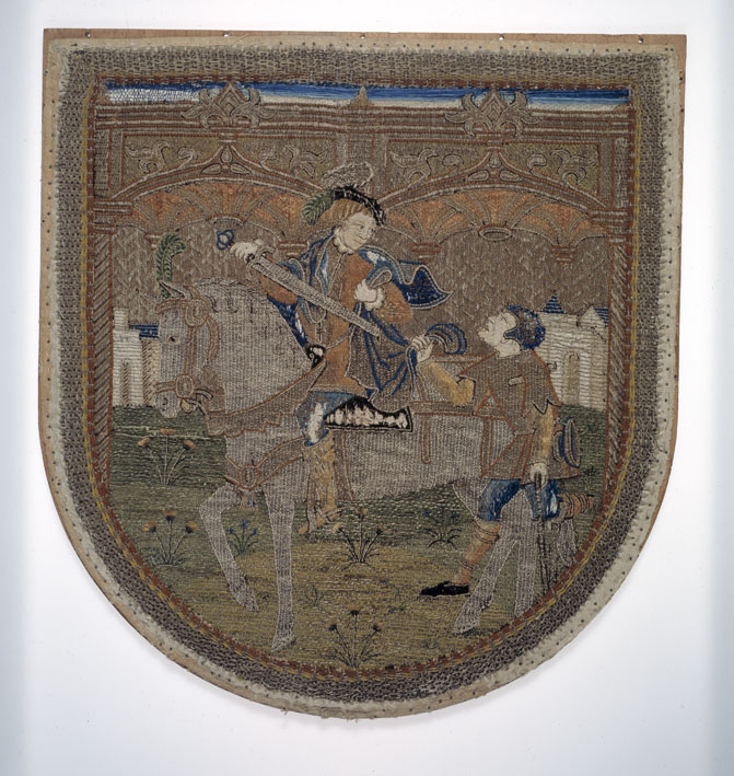Op het borduurwerk van het schild wordt onder een baldakijn met twee bogen, waarboven bladornamenten, en kruisribgewelven tegen een gedamasceerde achterwand het mantelwonder van St. Martinus (Sint Maarten) uitgebeeld. Martinus (316-397), gekleed als edelman met platte baret met veren, zit te paard en wendt zich om naar de bedelaar, intussen met zijn zwaard een stuk ...