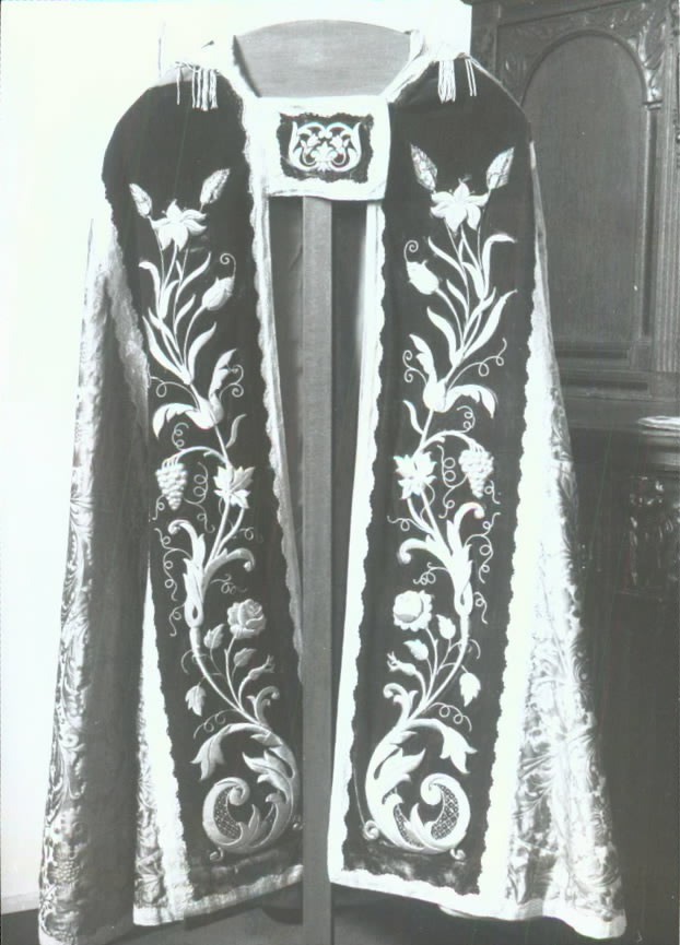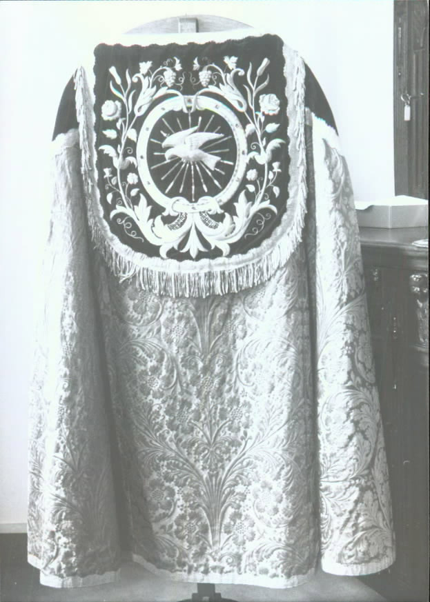 Wijnrode zijde met ingeweven bloemenpatroon, geheel afgebiesd met goudgalon. Voorkant afgezet met donkerrood fluweel, waarop borduursel van gouddraad (patroon met rozen, druiventrossen, wijnranken, lelies en korenaren). Voering van donkerrode zijde. Koorkapschild: medaillon met zilveren duif, rondom rozen, druiventrossen en andere bloemen. Langs goudgalon gouddraadfranje.