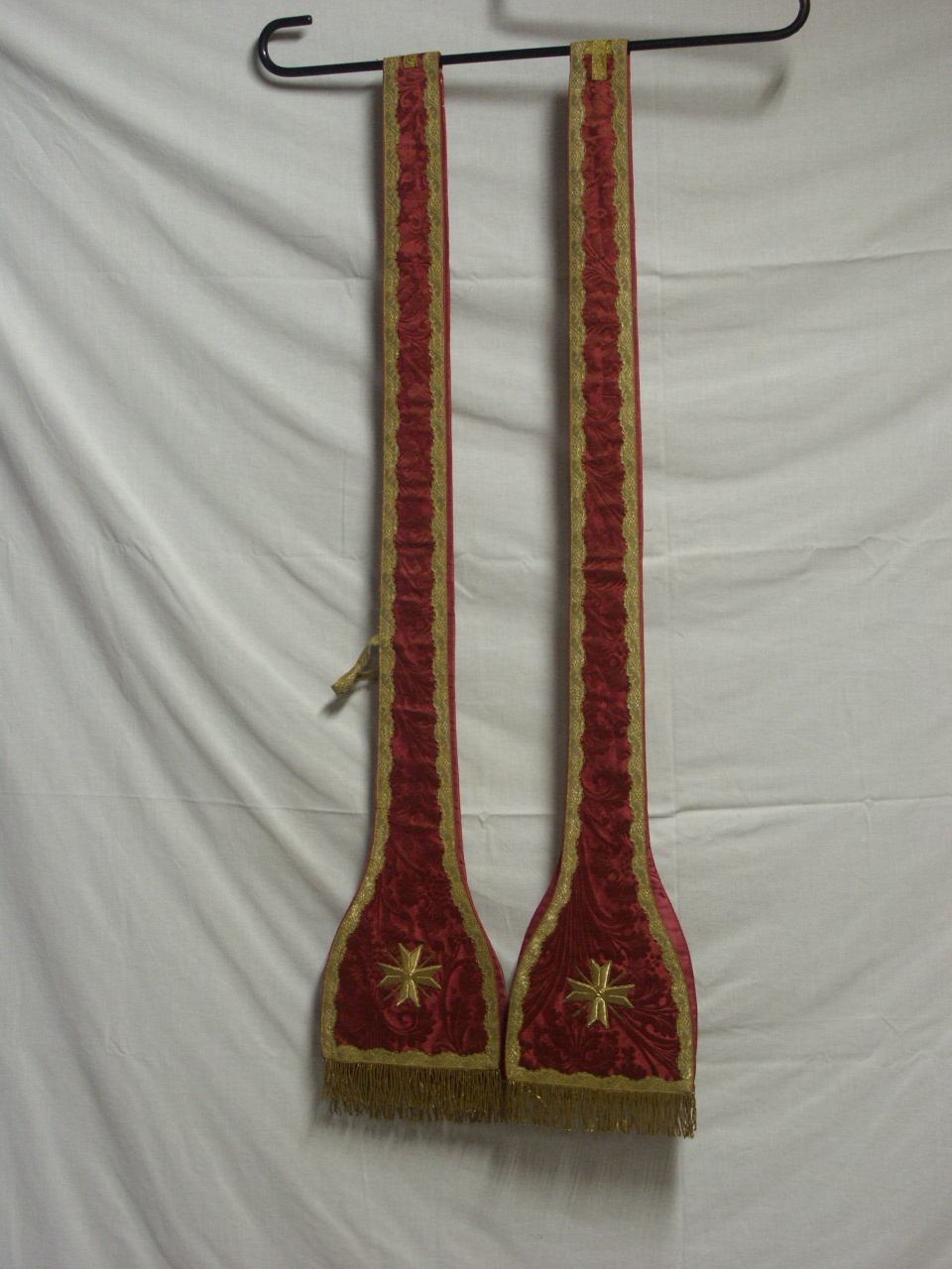 Rode stola met ingeweven bloempatroon afgezet met goudgalon en goudfranje