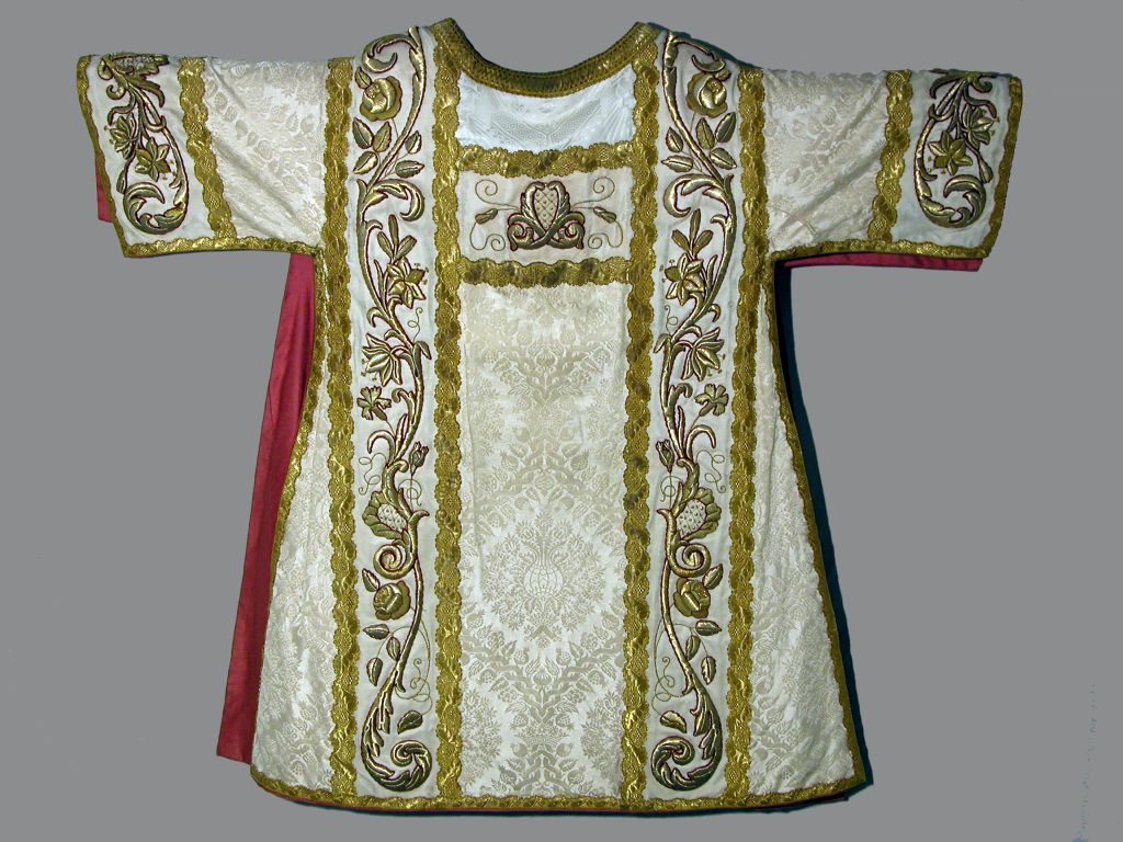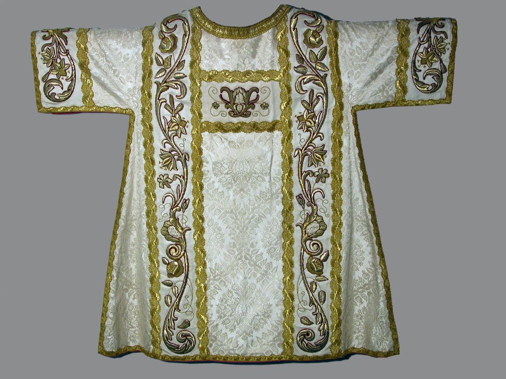 Witte (crème) dalmatiek met ingeweven granaatappelmotief, met gehoogd goudborduursel