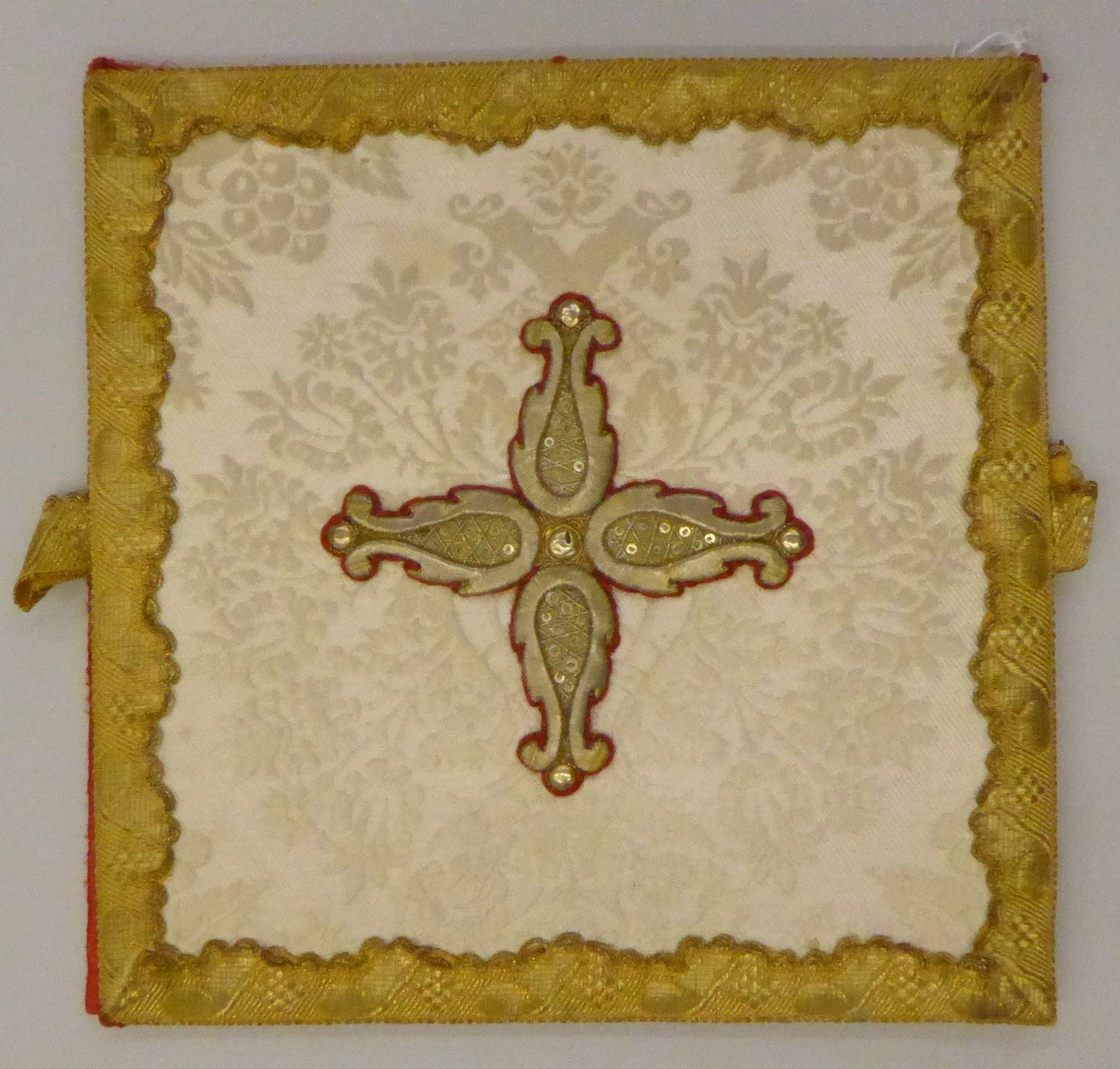 Witte (crème) beurs met ingeweven granaatappelmotief en geappliceerd gehoogd kruis