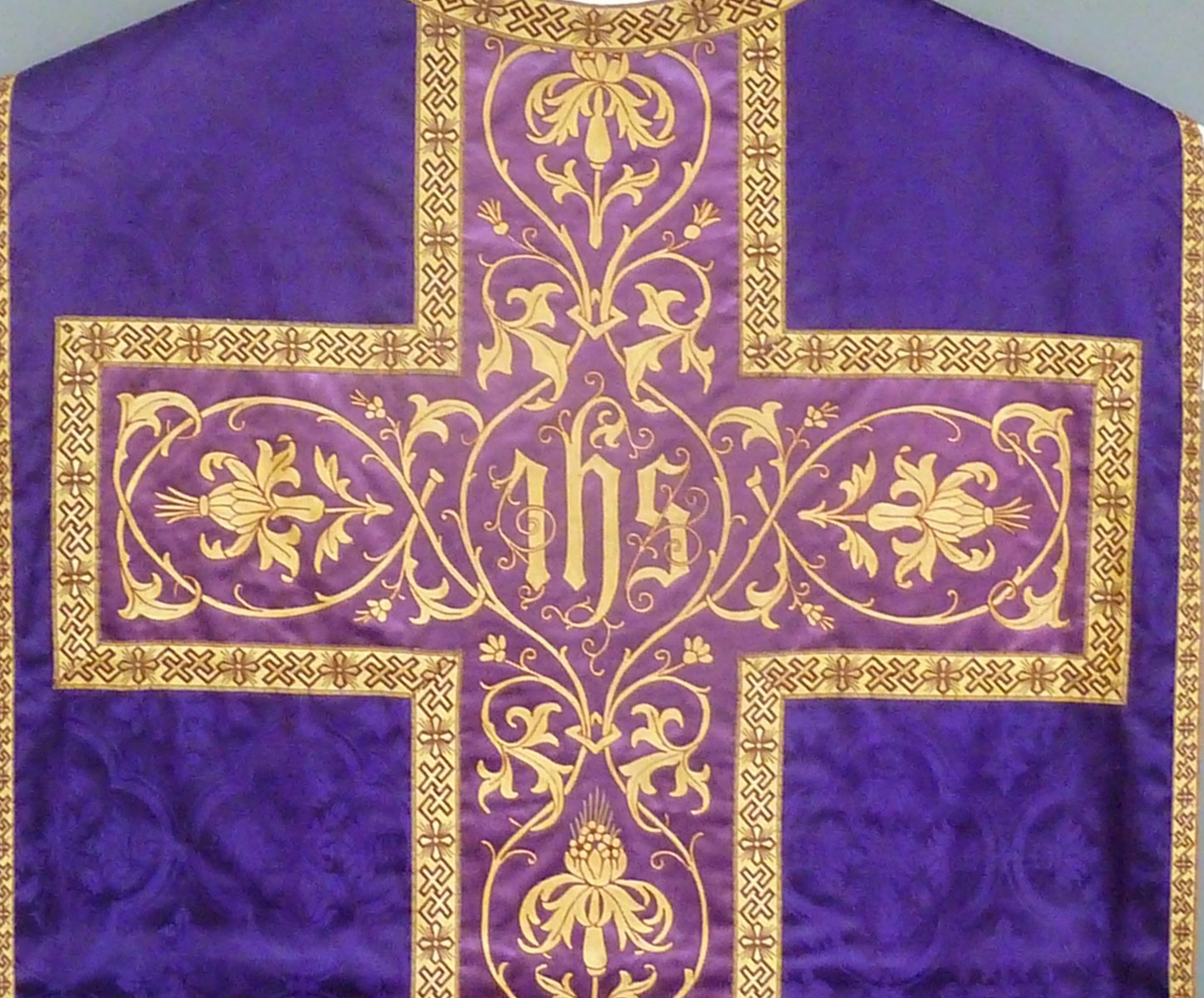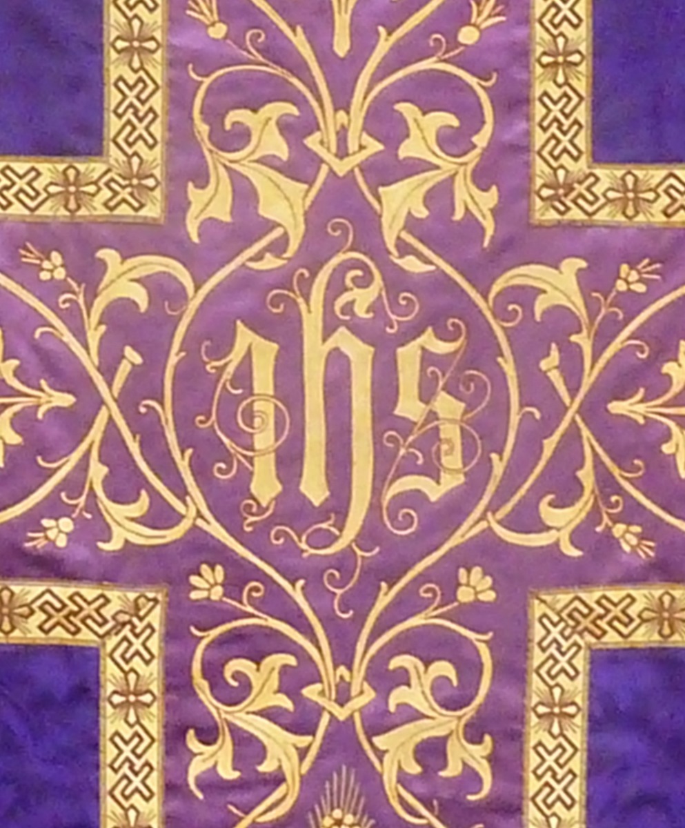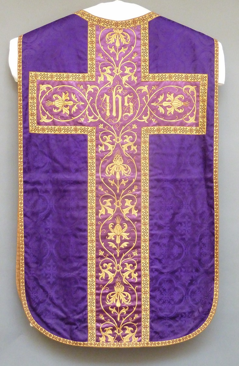 Paars kazuifel met paarse baan met gestyleerd bloemrankenborduursel, kruis idem met I.H.S.