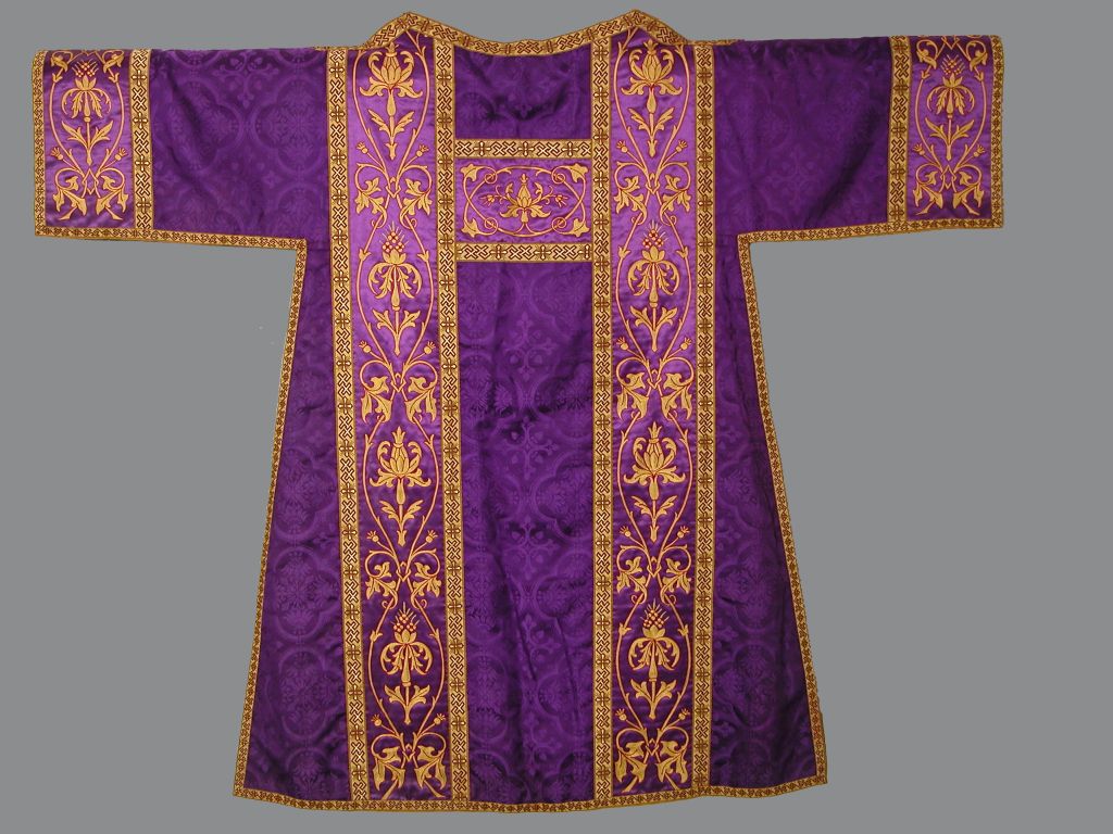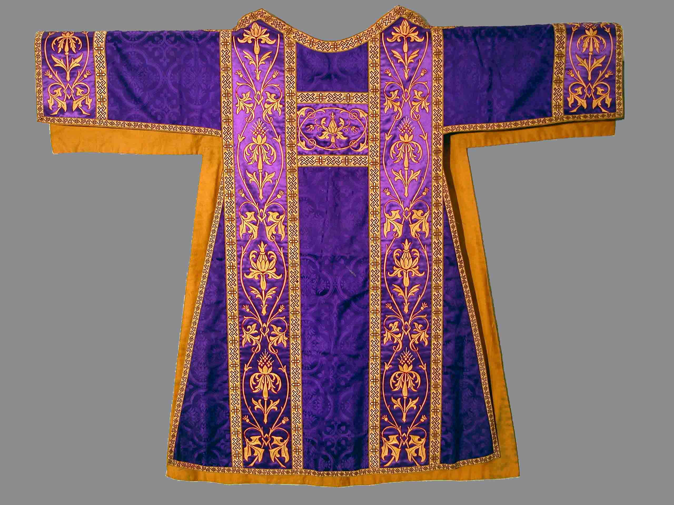 Paarse dalmatiek met paarse H-vormige banen met gestyleerd bloemrankenborduursel