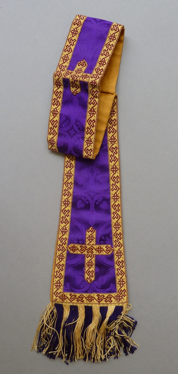 Paarse manipel afgezet met geel-rood galon en idem kruisje, met paars-gele franje