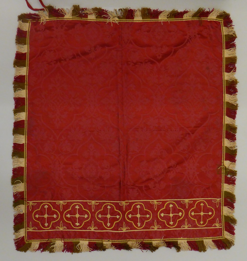 Rood kelkvelum met ingeweven bloempatroon, rand geborduurd met vierpasjes, rood-wit-groene franje