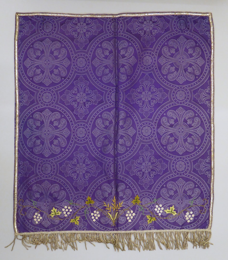 Paars kelkvelum geborduurd met druiventrossen en wijnranken, afgezet met zilverfranje