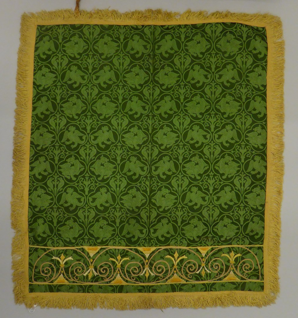Groen kelkvelum met ingeweven griffioenen in vierpassen met borduursel en gele franje