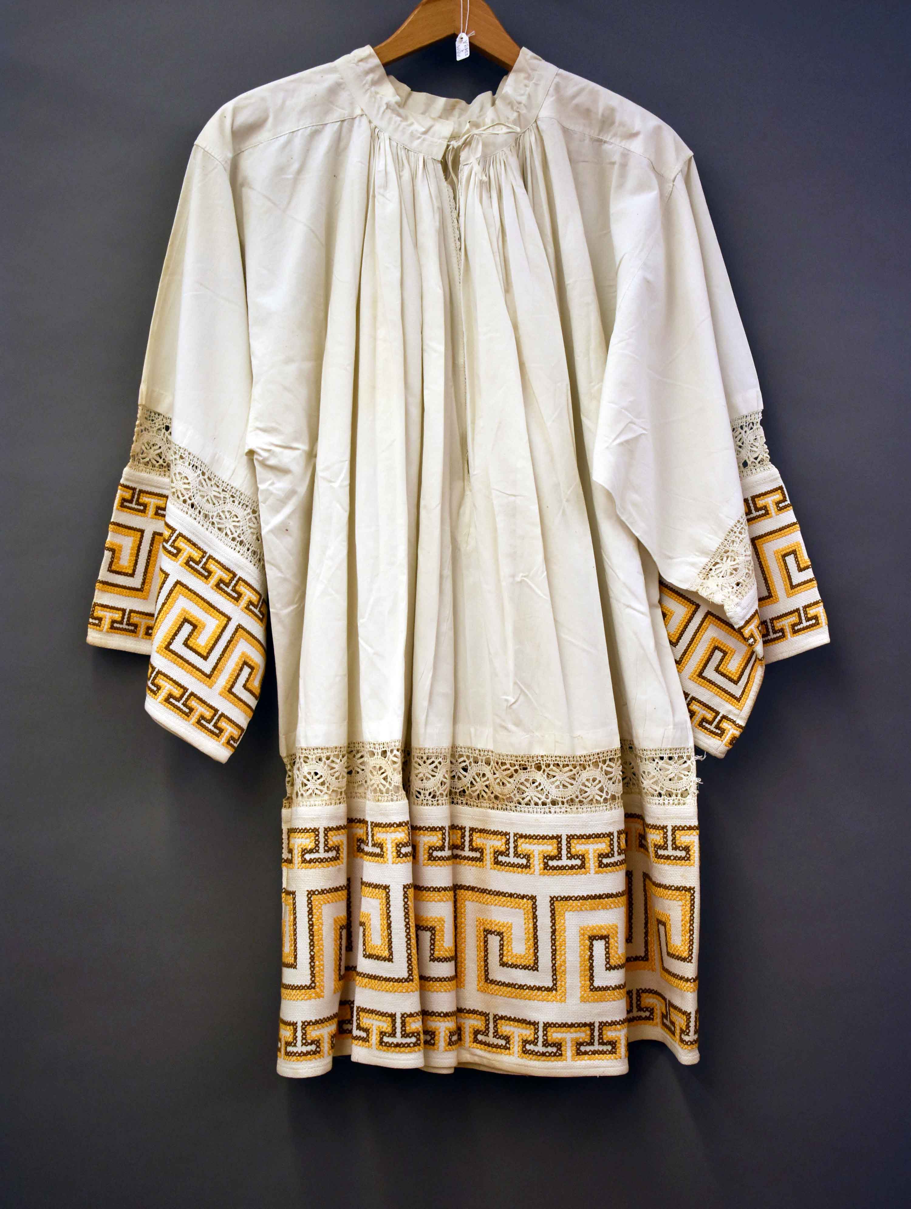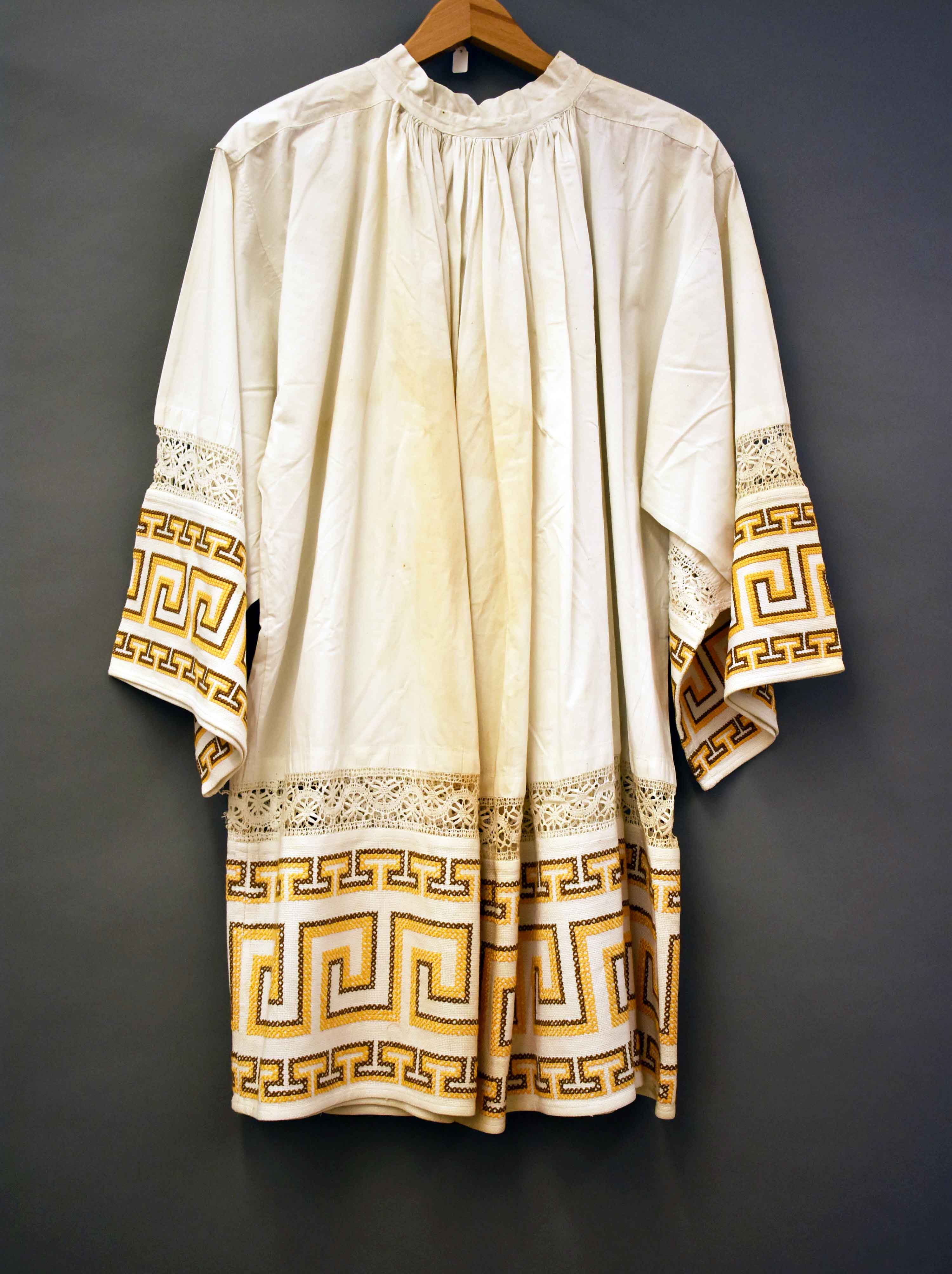 Superplie afgezet met machinaal kloskant en rand linnen geborduurd in meanderpatroon