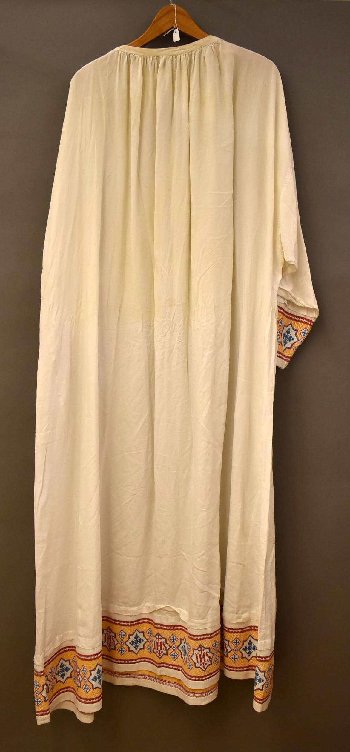 Albe met langs zoom en mouwen linnen met borduursel van I.H.S. en kruis en anker