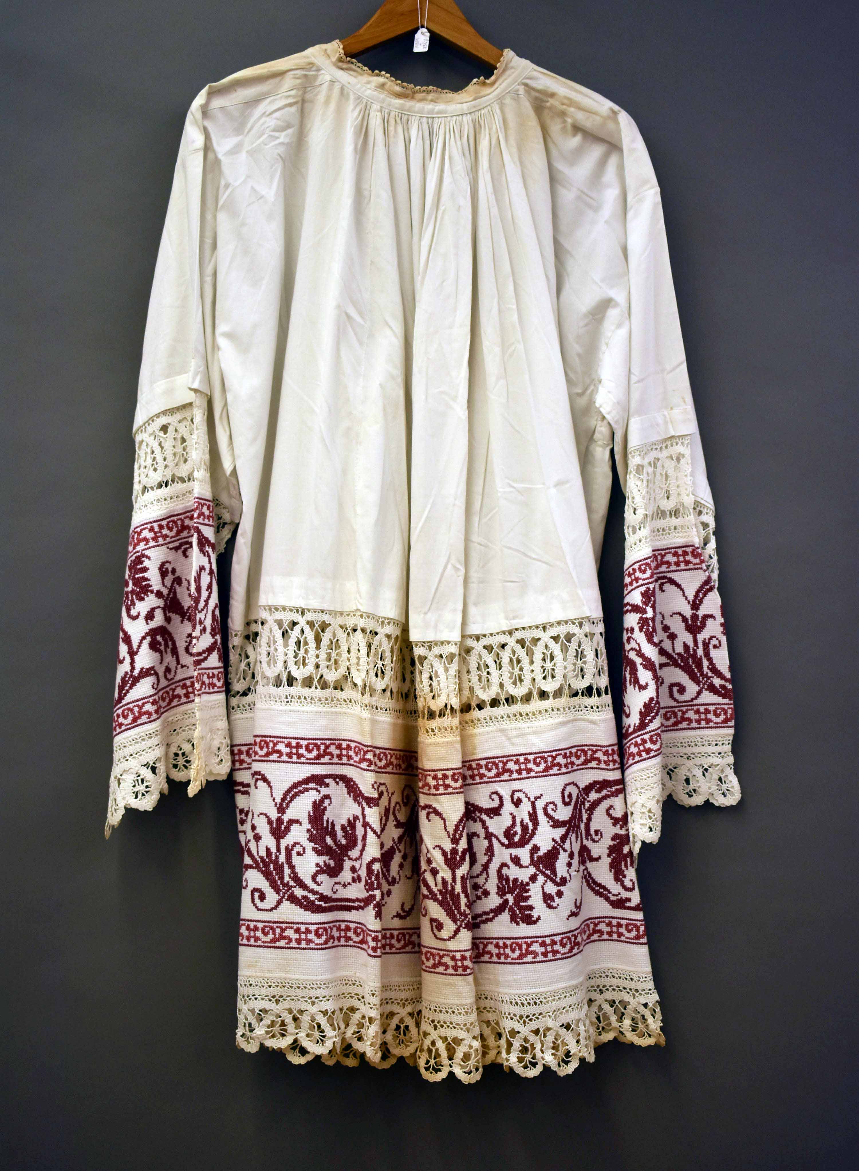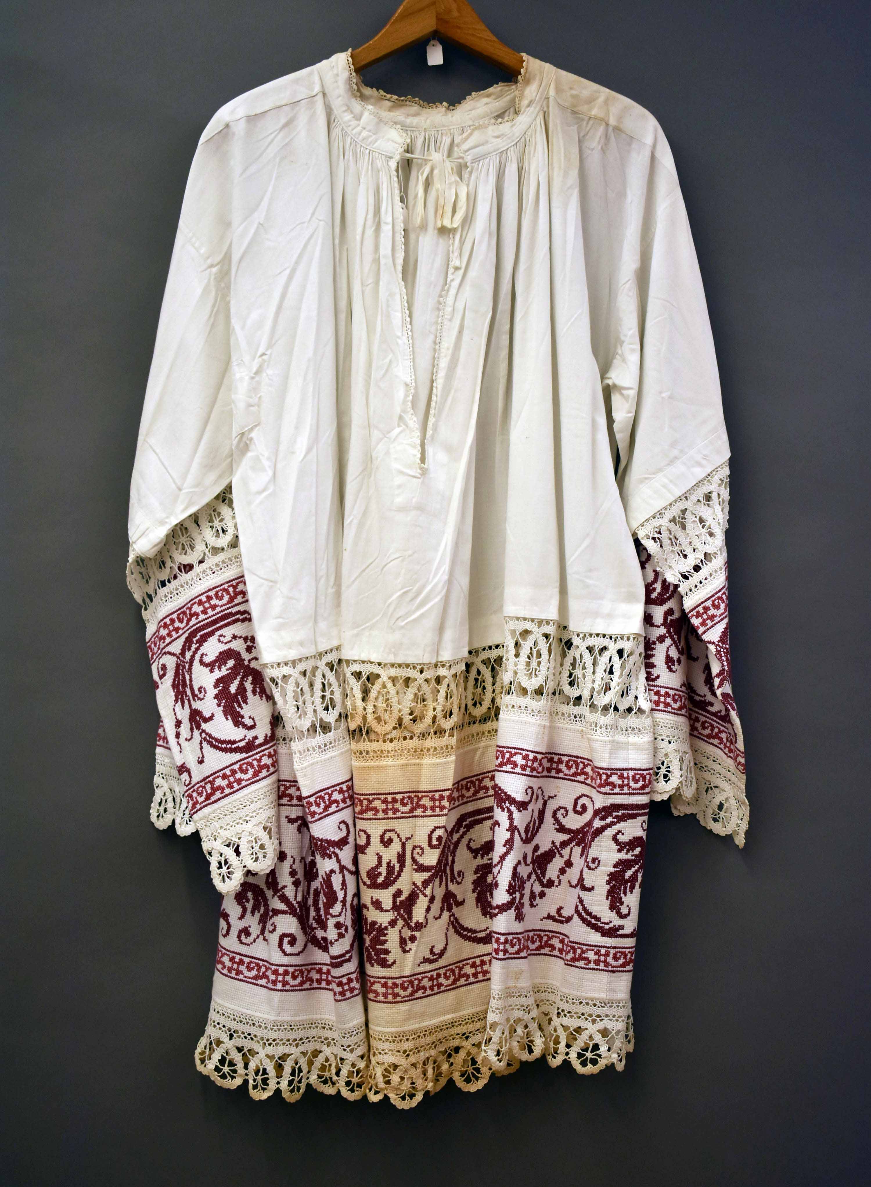 Superplie afgezet met gehaakt kant, linnen geborduurd met rode bloemenslingers