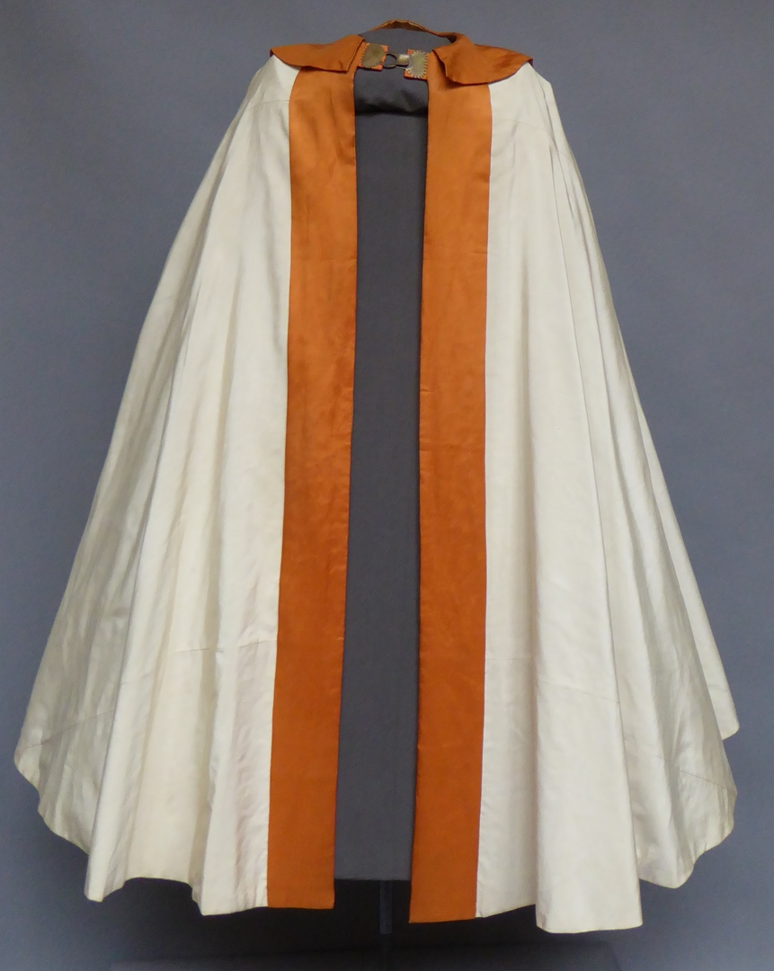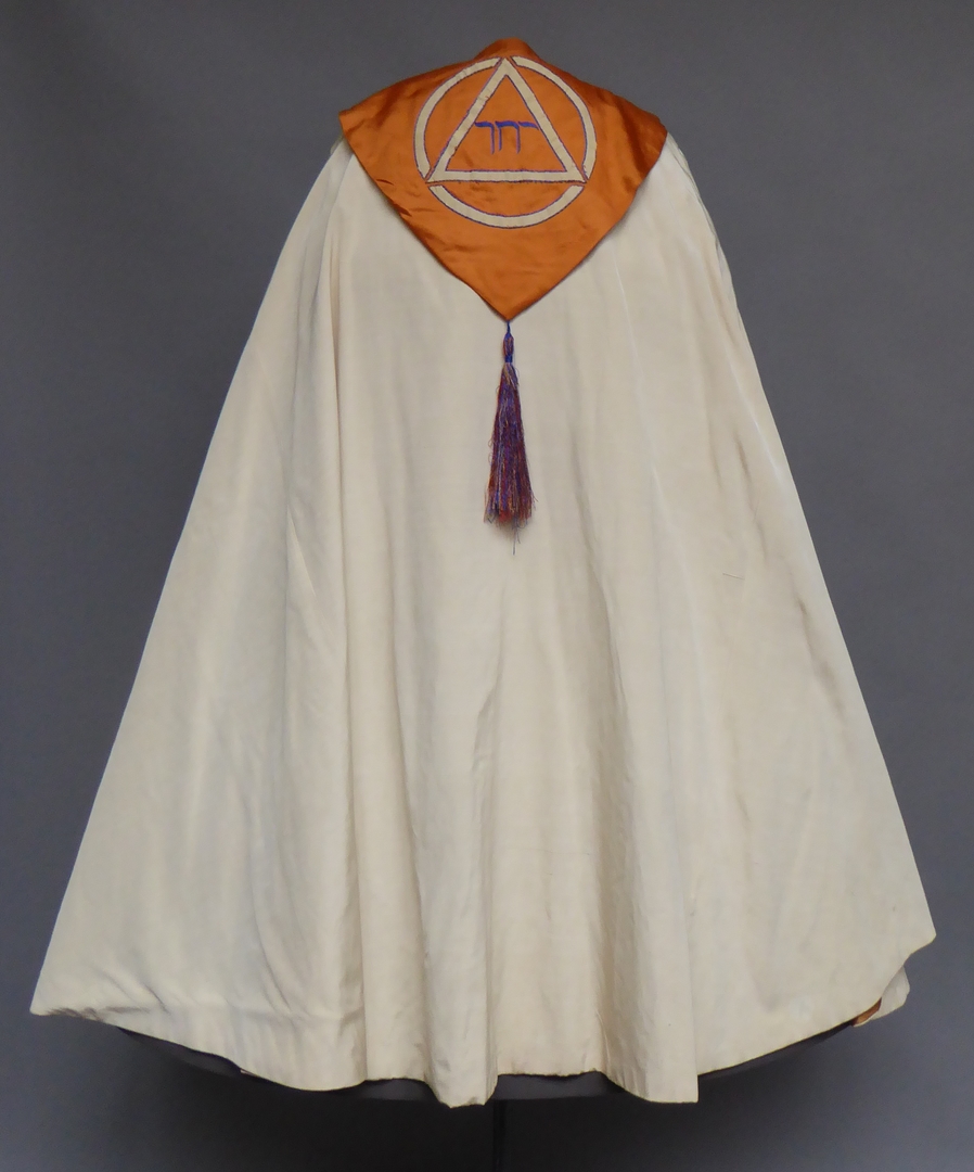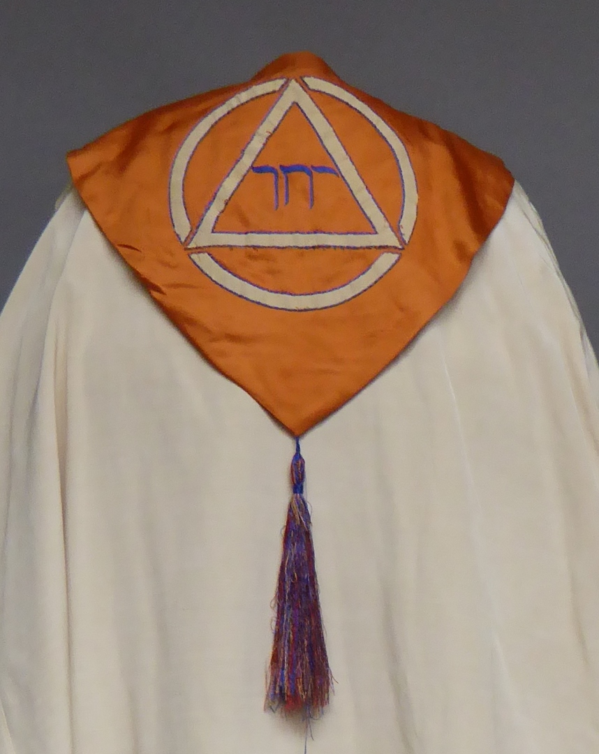 Witte koorkap met oranje schild met kwast, waarop Hebreeuwse tekst in driehoek