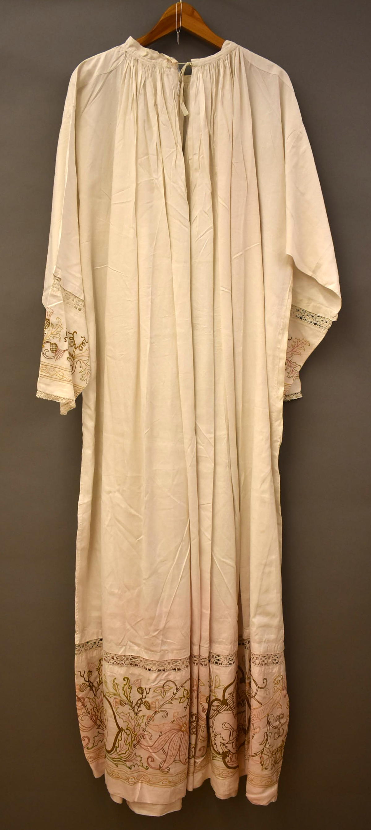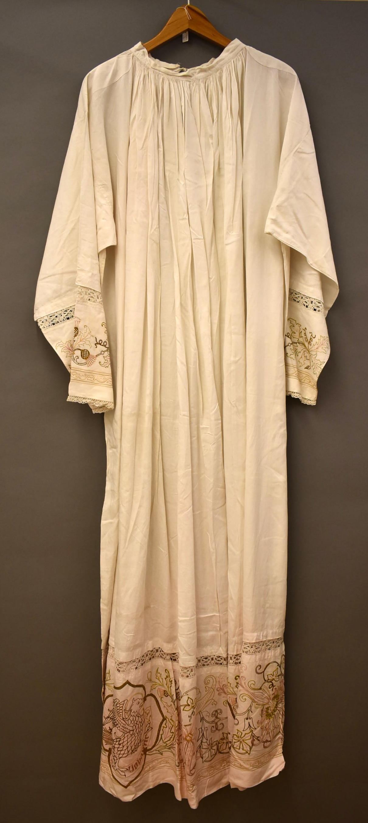 Albe met machinaal borduurwerk van neogotische bloem- en bladmotieven, met evangelistensymbolen