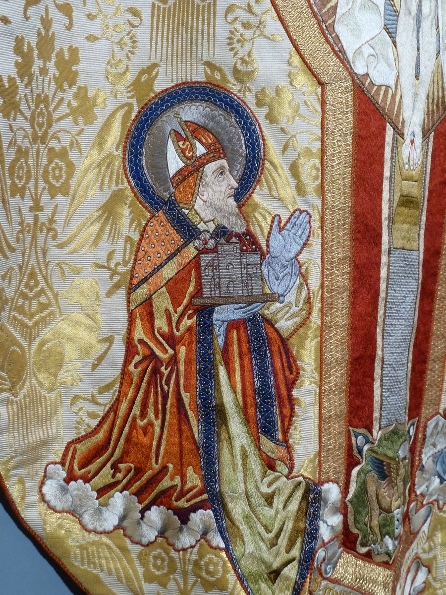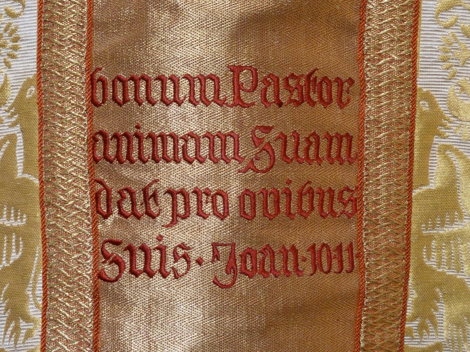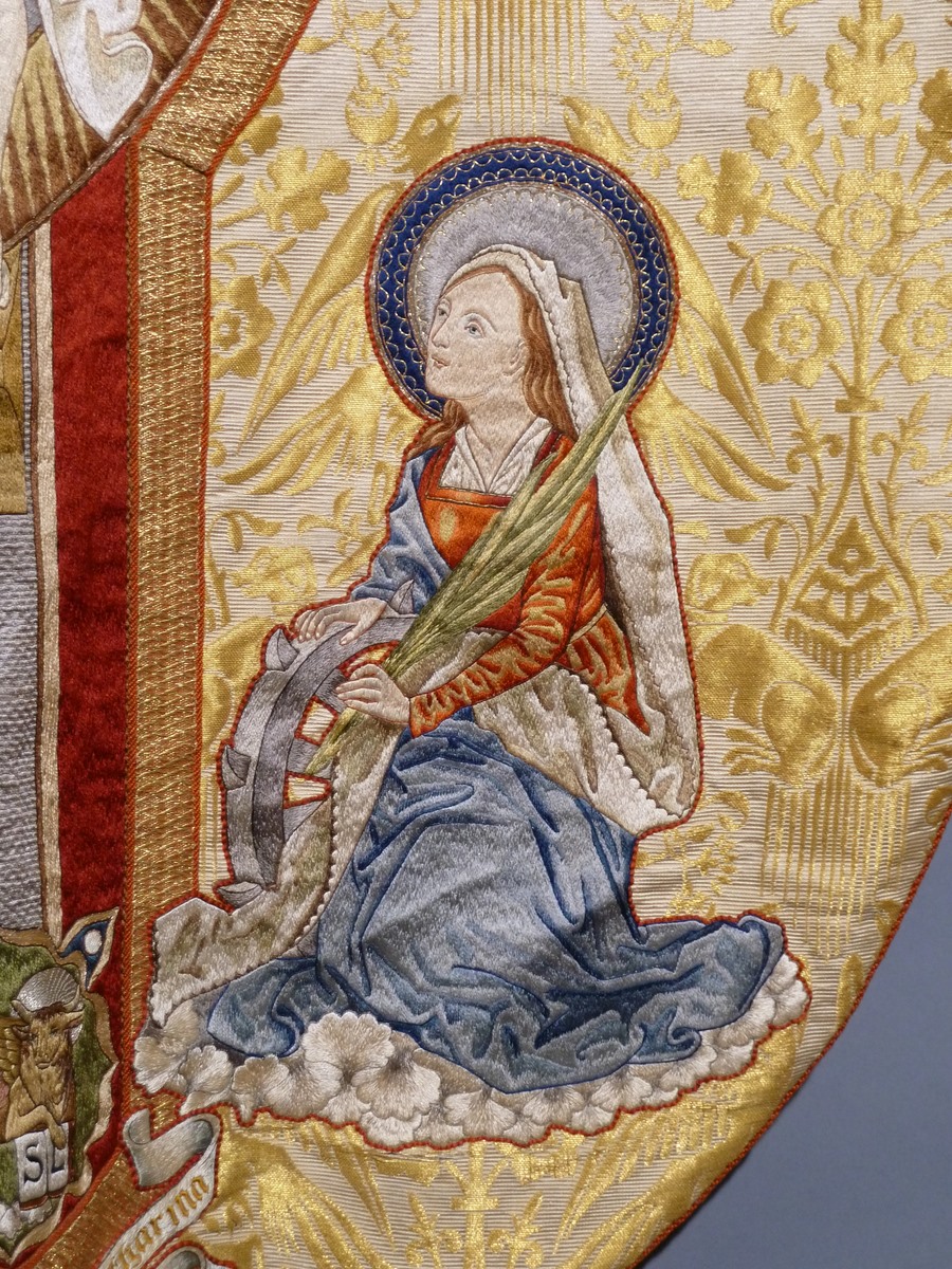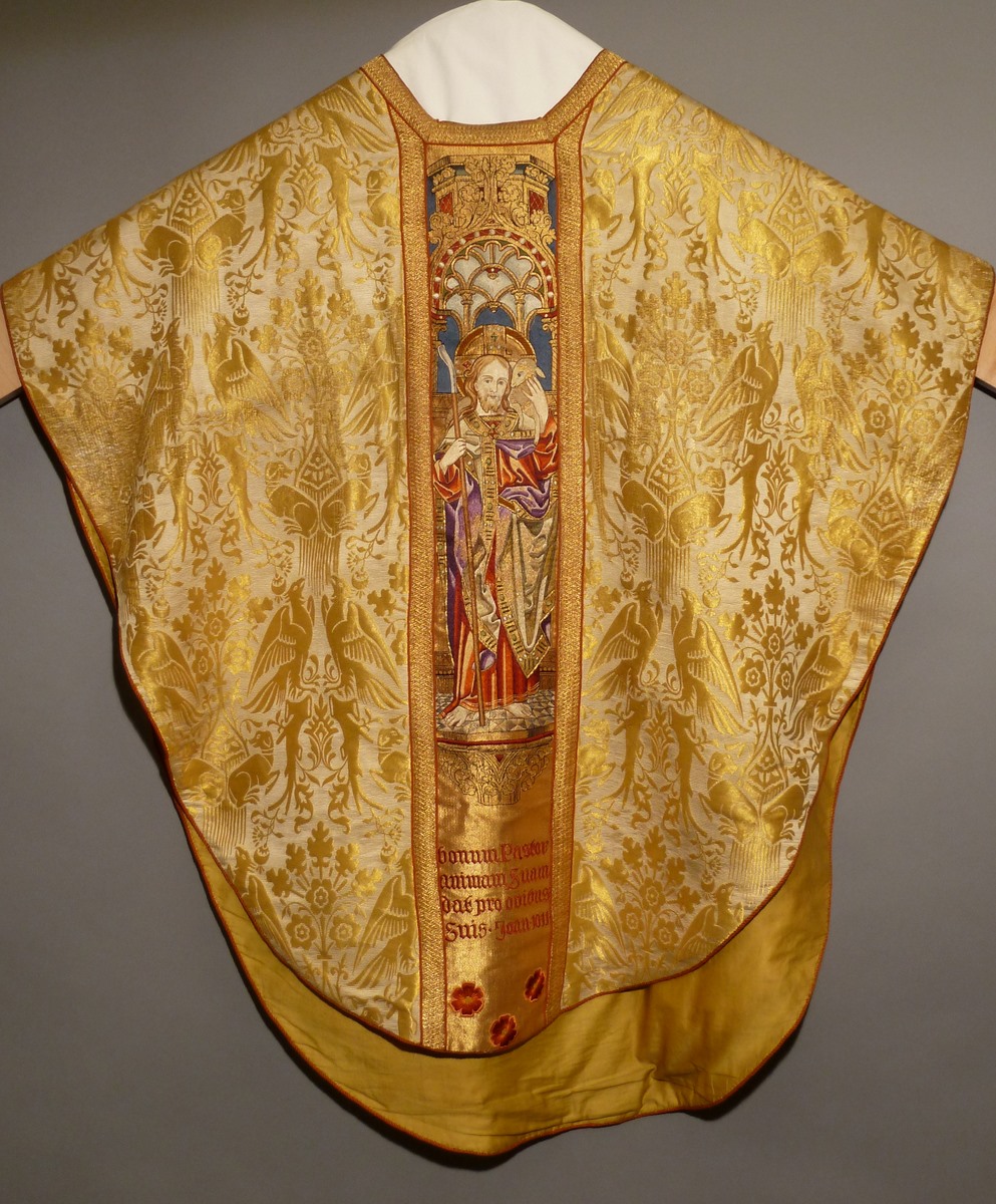 Kazuifel van goudbrokaat met Goede Herder, kruisiging, H. Catharina en Willibrord