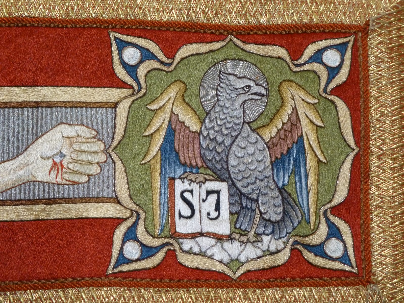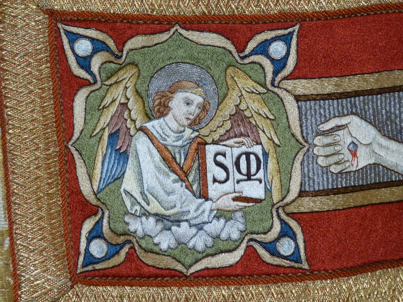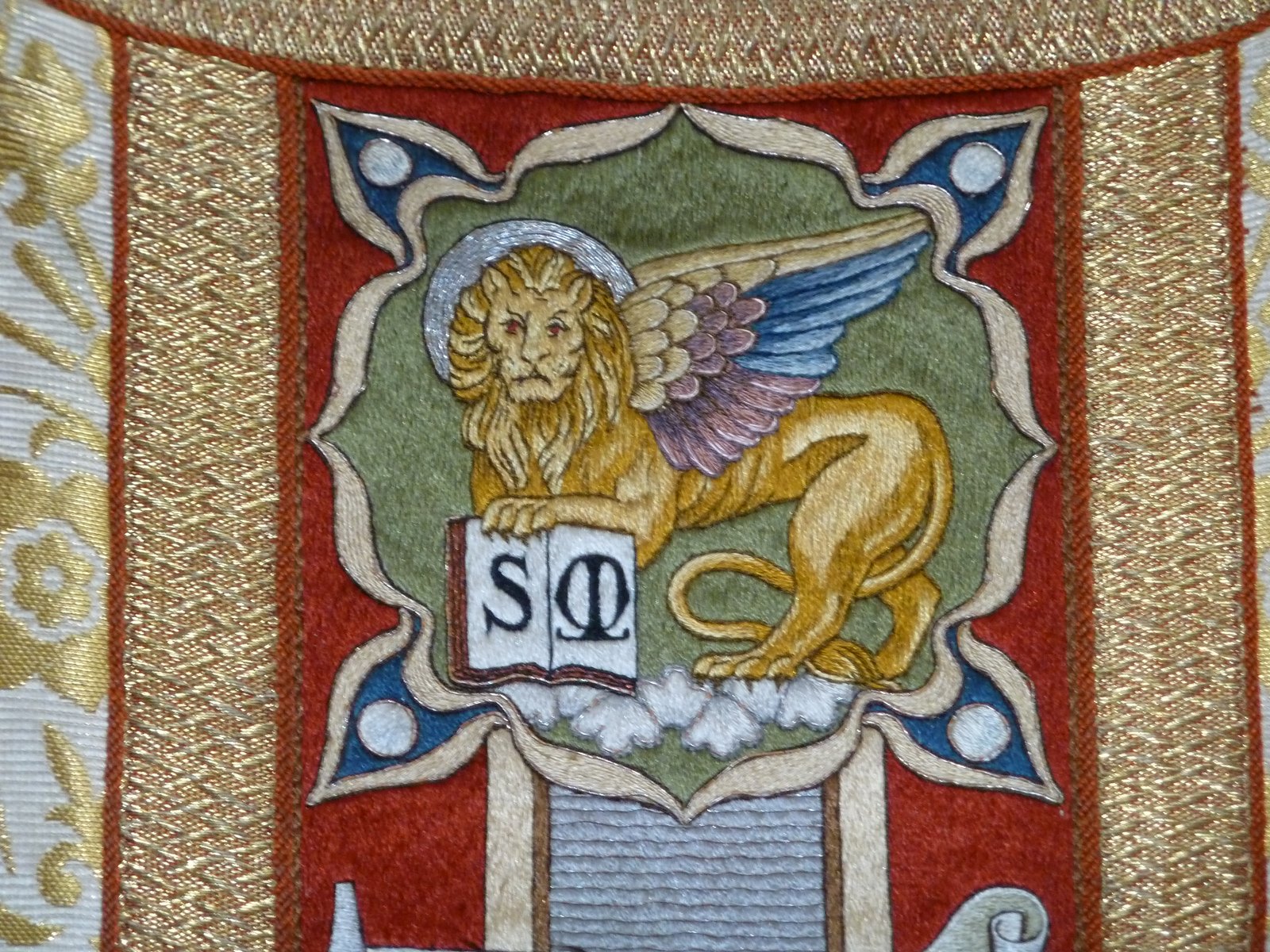 Kazuifel van goudbrokaat met Goede Herder, kruisiging, H. Catharina en Willibrord