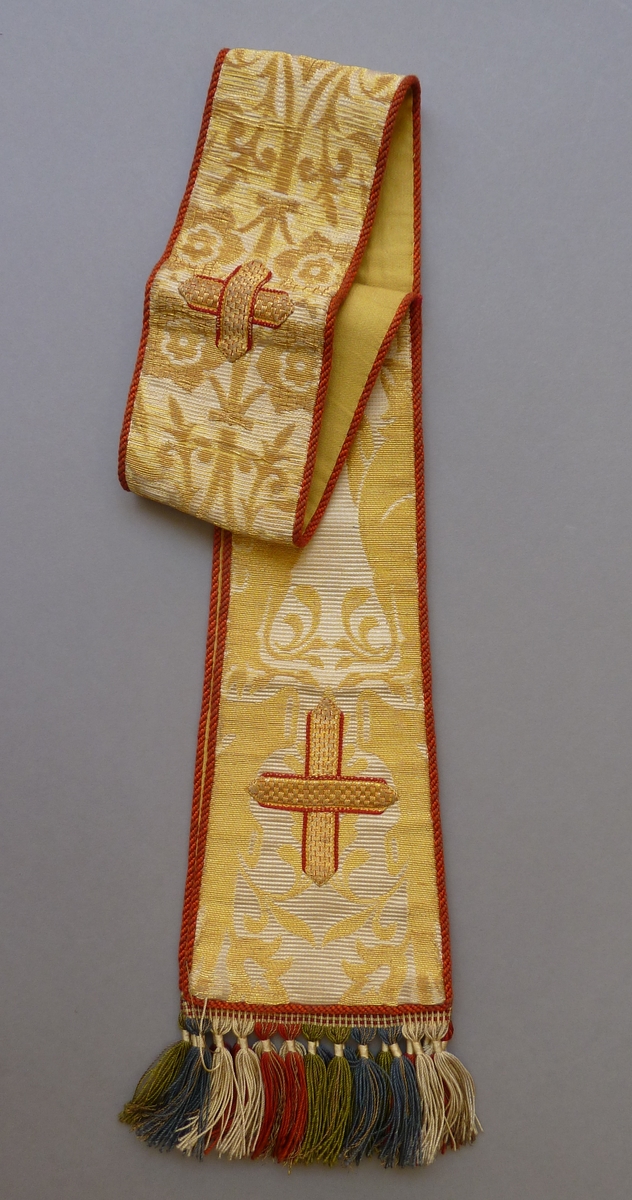 Manipel van goudbrokaat afgezet met rood koord en gekleurde zijden franje